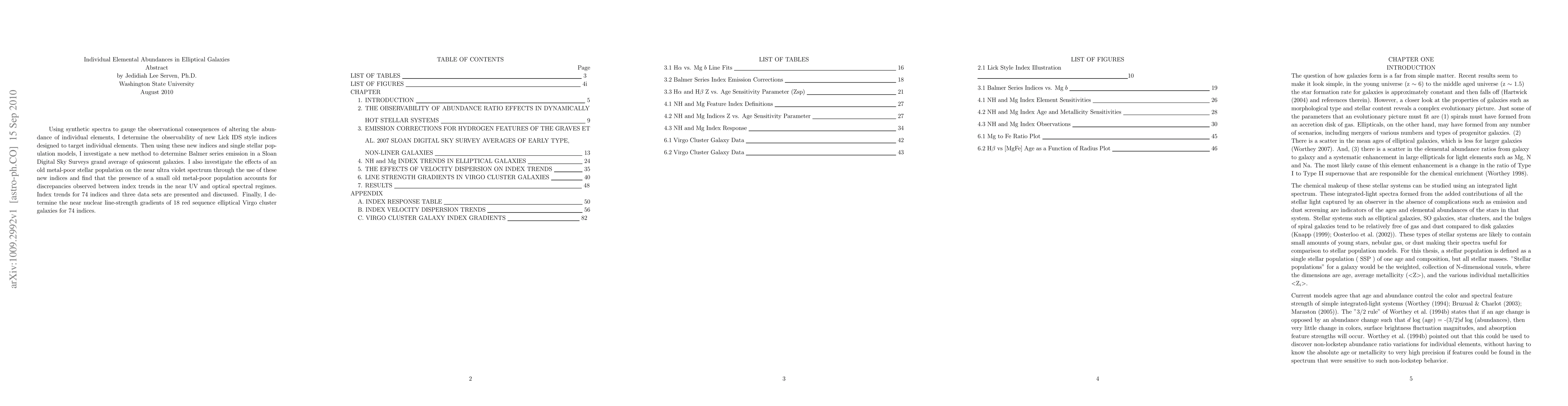 Using synthetic spectra to gauge the observational consequences of altering the abundance of individual elements, I determine the observability of new Lick IDS style indices designed to target individual elements. Then using these new indices and single stellar population models, I investigate a new method to determine Balmer series emission in a Sloan Digital Sky Surveys grand average of quiescent galaxies. I also investigate the effects of an old metal-poor stellar population on the near ultra violet spectrum through the use of these new indices and find that the presence of a small old metal-poor population accounts for discrepancies observed between index trends in the near UV and optical spectral regimes. Index trends for 74 indices and three data sets are presented and discussed. Finally, I determine the near nuclear line-strength gradients of 18 red sequence elliptical Virgo cluster galaxies for 74 indices.