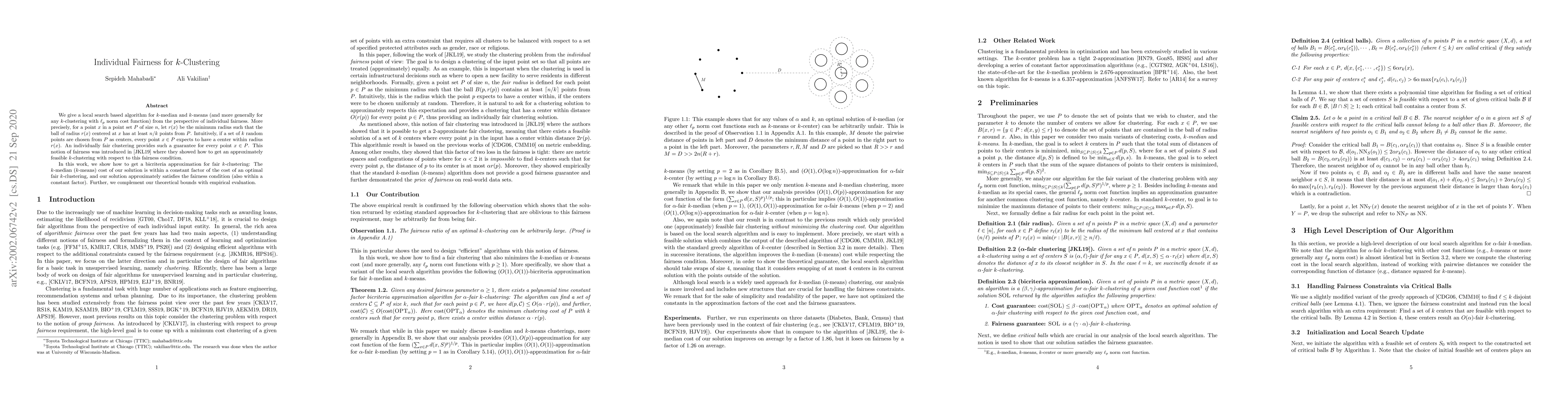 We give a local search based algorithm for $k$-median and $k$-means (and more generally for any $k$-clustering with $\ell_p$ norm cost function) from the perspective of individual fairness. More precisely, for a point $x$ in a point set $P$ of size $n$, let $r(x)$ be the minimum radius such that the ball of radius $r(x)$ centered at $x$ has at least $n/k$ points from $P$. Intuitively, if a set of $k$ random points are chosen from $P$ as centers, every point $x\in P$ expects to have a center within radius $r(x)$. An individually fair clustering provides such a guarantee for every point $x\in P$. This notion of fairness was introduced in [Jung et al., 2019] where they showed how to get an approximately feasible $k$-clustering with respect to this fairness condition. In this work, we show how to get a bicriteria approximation for fair $k$-clustering: The $k$-median ($k$-means) cost of our solution is within a constant factor of the cost of an optimal fair $k$-clustering, and our solution approximately satisfies the fairness condition (also within a constant factor). Further, we complement our theoretical bounds with empirical evaluation.
