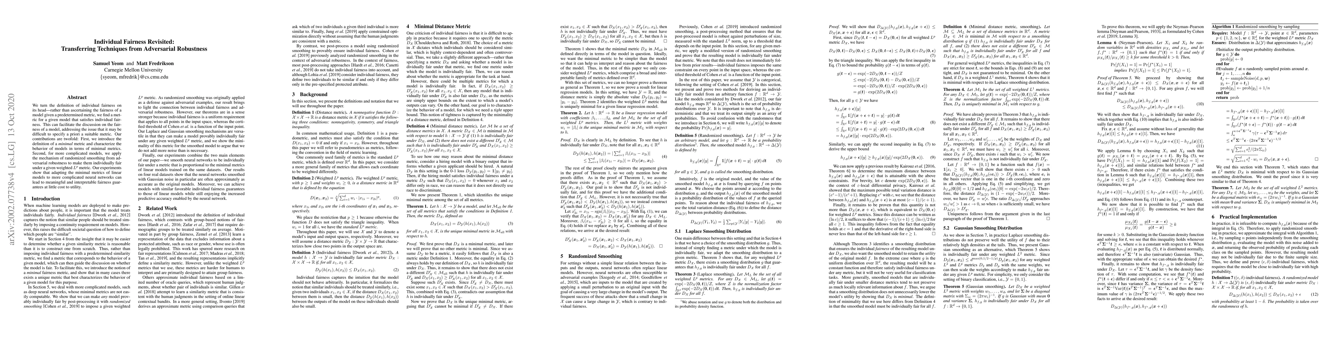 This paper redefines individual fairness by determining a metric that satisfies fairness for a given model, rather than assessing fairness with a predefined metric. It introduces minimal metrics and applies randomized smoothing from adversarial robustness to make complex models individually fair, demonstrating that this adaptation can provide interpretable fairness guarantees with minimal loss in utility.