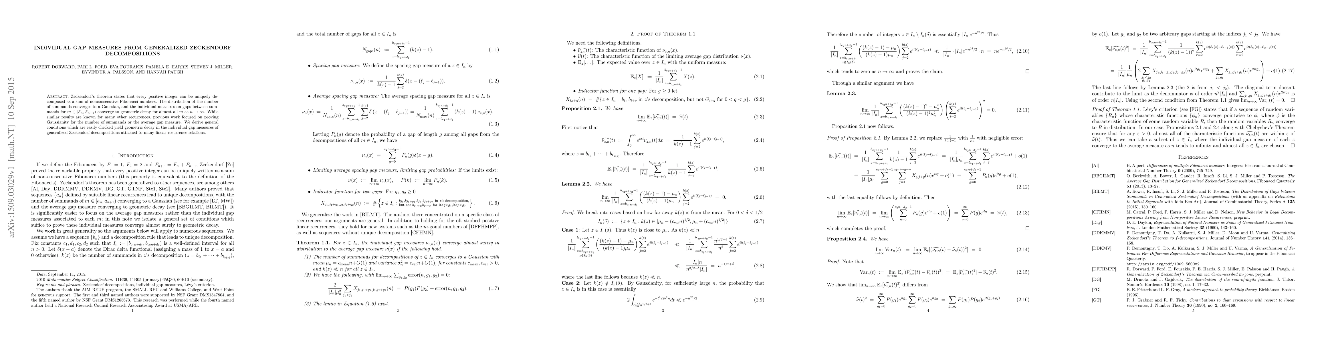 This paper explores the generalized Zeckendorf decomposition, proving that individual gap measures between summands converge to geometric decay for almost all numbers in large intervals, extending beyond the traditional Fibonacci sequence to various linear recurrence relations. The study provides general conditions for this geometric decay.