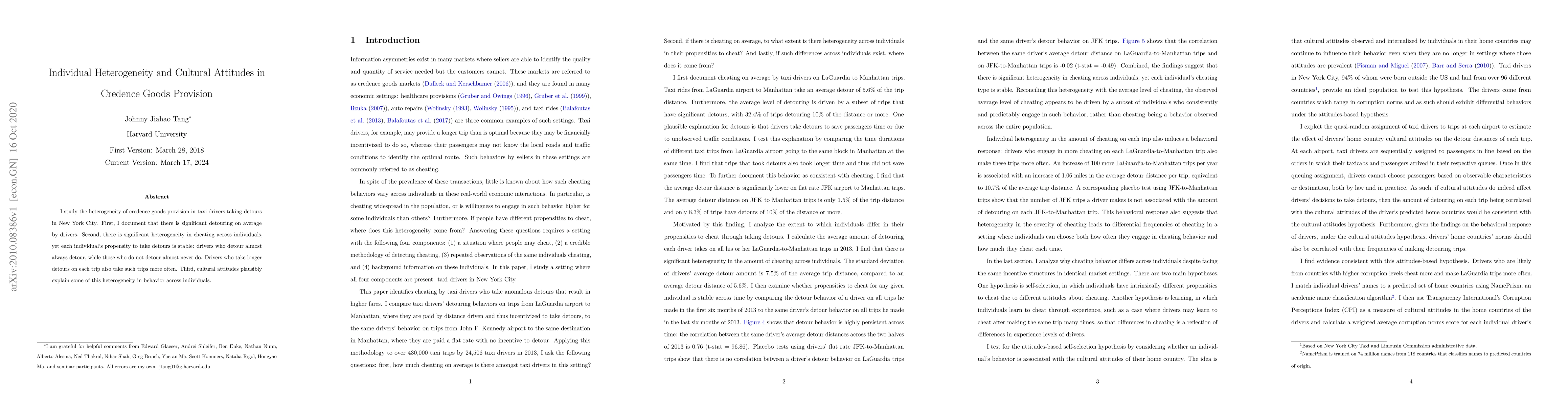 I study the heterogeneity of credence goods provision in taxi drivers taking detours in New York City. First, I document that there is significant detouring on average by drivers. Second, there is significant heterogeneity in cheating across individuals, yet each individual's propensity to take detours is stable: drivers who detour almost always detour, while those who do not detour almost never do. Drivers who take longer detours on each trip also take such trips more often. Third, cultural attitudes plausibly explain some of this heterogeneity in behavior across individuals.
