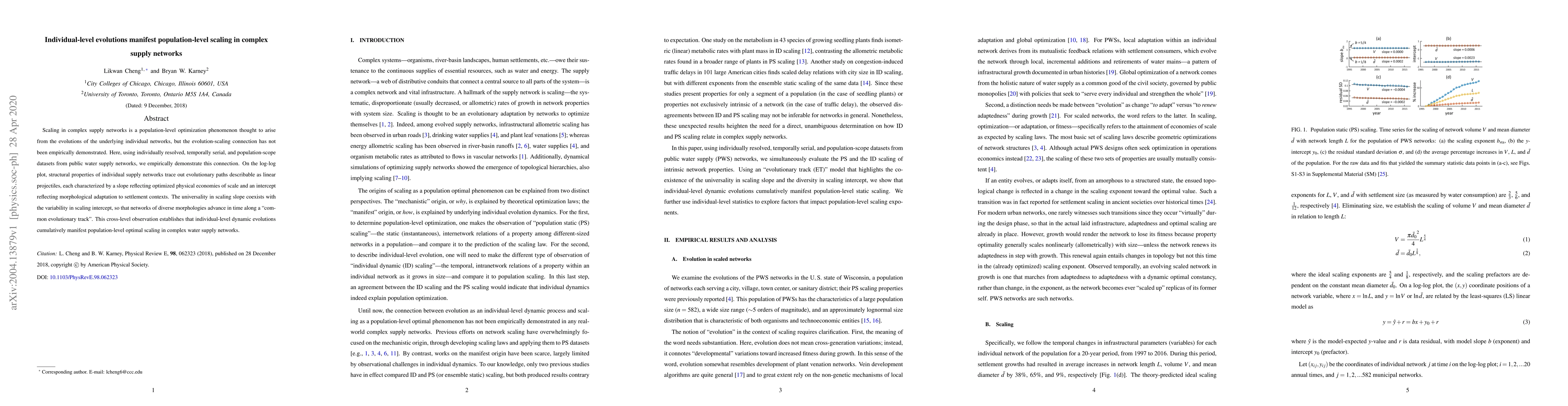Scaling in complex supply networks is a population-level optimization phenomenon thought to arise from the evolutions of the underlying individual networks, but the evolution-scaling connection has not been empirically demonstrated. Here, using individually resolved, temporally serial, and population-scope datasets from public water supply networks, we empirically demonstrate this connection. On the log-log plot, structural properties of individual supply networks trace out evolutionary paths describable as linear projectiles, each characterized by a slope reflecting optimized physical economies of scale and an intercept reflecting morphological adaptation to settlement contexts. The universality in scaling slope coexists with the variability in scaling intercept, so that networks of diverse morphologies advance in time along a "common evolutionary track". This cross-level observation establishes that individual-level dynamic evolutions cumulatively manifest population-level optimal scaling in complex water supply networks.