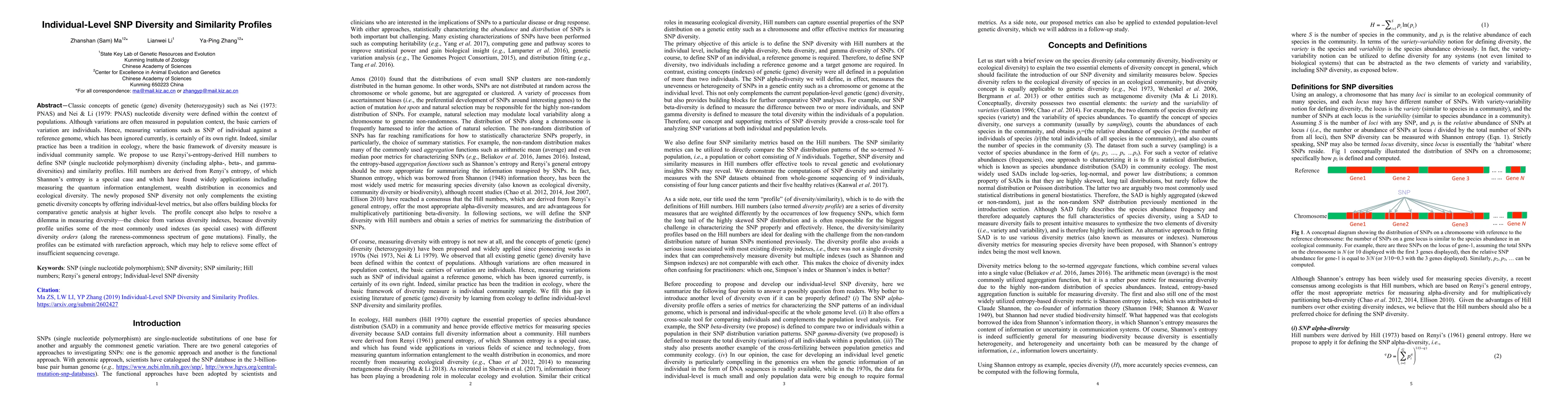 Classic concepts of genetic (gene) diversity (heterozygosity) such as Nei (1973: PNAS) and Nei and Li (1979: PNAS) nucleotide diversity were defined within the context of populations. Although variations are often measured in population context, the basic carriers of variation are individuals. Hence, measuring variations such as SNP of individual against a reference genome, which has been ignored currently, is certainly of its own right. Indeed, similar practice has been a tradition in ecology, where the basic framework of diversity measure is individual community sample. We propose to use Renyi-entropy-derived Hill numbers to define SNP (single nucleotide polymorphism) diversity (including alpha-, beta-, and gamma-diversities) and similarity profiles. Hill numbers are derived from Renyi entropy, of which Shannon entropy is a special case and which have found widely applications including measuring the quantum information entanglement, wealth distribution in economics and ecological diversity. The newly proposed SNP diversity not only complements the existing genetic diversity concepts by offering individual-level metrics, but also offers building blocks for comparative genetic analysis at higher levels. The profile concept also helps to resolve a dilemma in measuring diversity: the choice from various diversity indexes, because diversity profile unifies some of the most commonly used indexes (as special cases) with different diversity orders (along the rareness-commonness spectrum of gene mutations). Finally, the profiles can be estimated with rarefaction approach, which may help to relieve some effect of insufficient sequencing coverage.