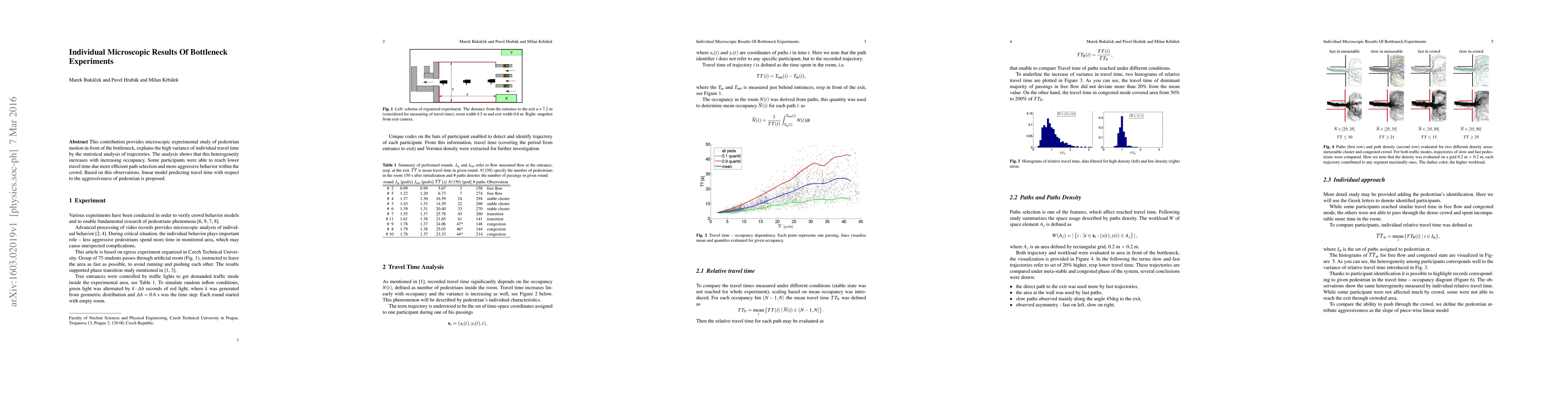 This contribution provides microscopic experimental study of pedestrian motion in front of the bottleneck, explains the high variance of individual travel time by the statistical analysis of trajectories. The analysis shows that this heterogeneity increases with increasing occupancy. Some participants were able to reach lower travel time due more efficient path selection and more aggressive behavior within the crowd. Based on this observations, linear model predicting travel time with respect to the aggressiveness of pedestrian is proposed.
