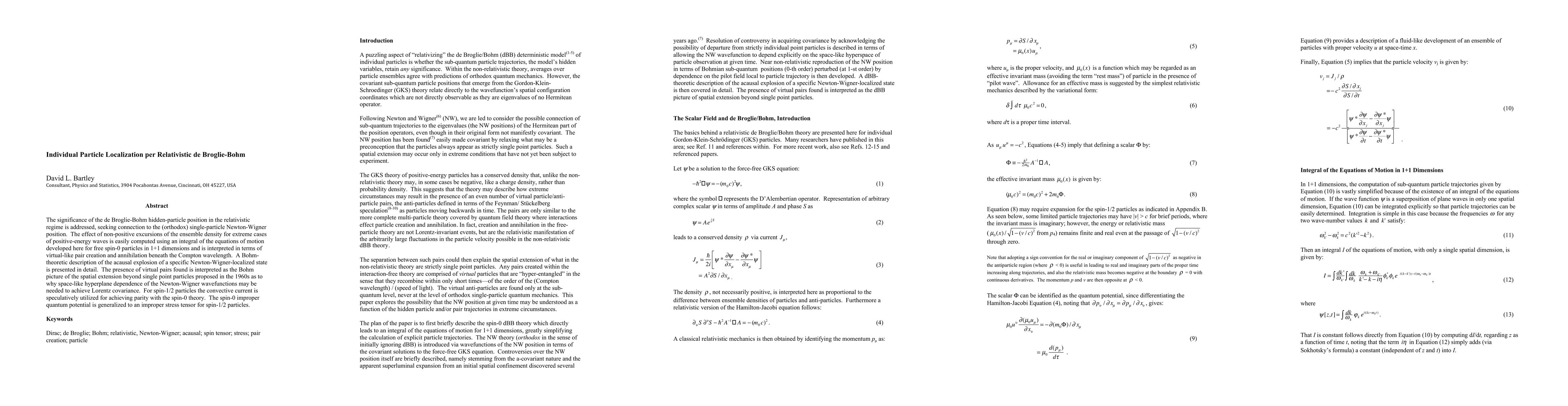The significance of the de Broglie-Bohm hidden-particle position in the relativistic regime is addressed, seeking connection to the (orthodox) single-particle Newton-Wigner position. The effect of non-positive excursions of the ensemble density for extreme cases of positive-energy waves is easily computed using an integral of the equations of motion developed here for free spin-0 particles in 1+1 dimensions and is interpreted in terms of virtual-like pair creation and annihilation beneath the Compton wavelength. A Bohmtheoretic description of the acausal explosion of a specific Newton-Wigner-localized state is presented in detail. The presence of virtual pairs found is interpreted as the Bohm picture of the spatial extension beyond single point particles proposed in the 1960s as to why space-like hyperplane dependence of the Newton-Wigner wavefunctions may be needed to achieve Lorentz covariance. For spin-1/2 particles the convective current is speculatively utilized for achieving parity with the spin-0 theory. The spin-0 improper quantum potential is generalized to an improper stress tensor for spin-1/2 particles.