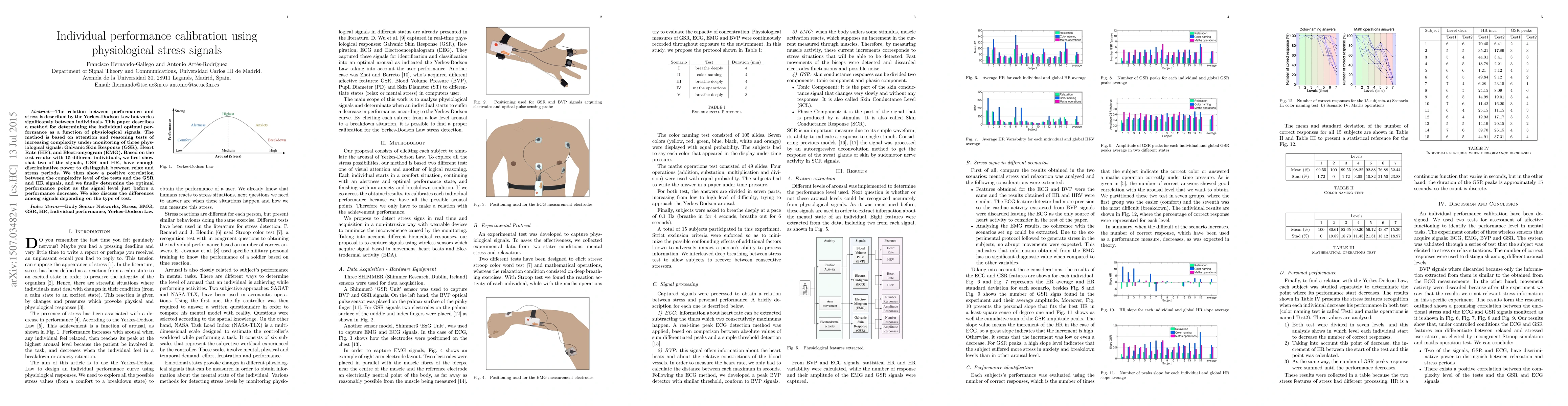This paper proposes a method to determine individual optimal performance levels based on physiological stress signals, specifically GSR and HR, during attention and reasoning tests. The study finds a positive correlation between test complexity and these signals, identifying the optimal performance point just before performance decline.