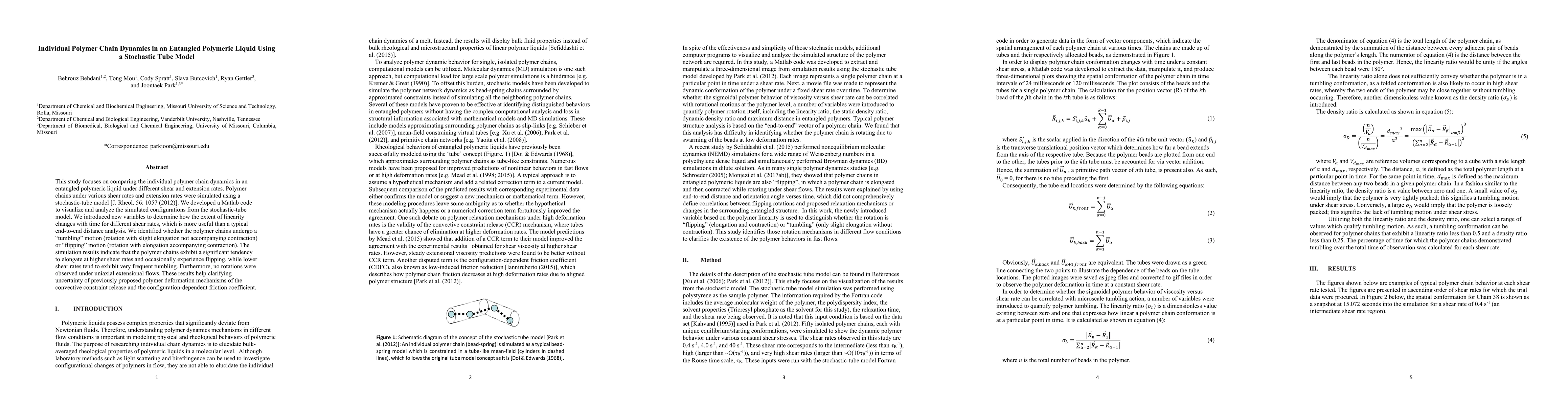 This study focuses on comparing the individual polymer chain dynamics in an entangled polymeric liquid under different shear and extension rates. Polymer chains under various shear rates and extension rates were simulated using a stochastic-tube model [J. Rheol. 56: 1057 (2012)]. We developed a Matlab code to visualize and analyze the simulated configurations from the stochastic-tube model. We introduced new variables to determine how the extent of linearity changes with time for different shear rates, which is more useful than a typical end-to-end distance analysis. We identified whether the polymer chains undergo a tumbling rotation (slight elongation not accompanying contraction) or flipping rotation (elongation accompanying contraction). The simulation results indicate that the polymer chains exhibit a significant tendency to elongate at higher shear rates and occasionally experience flipping, while lower shear rates tend to exhibit very frequent tumbling. Furthermore, no rotations were observed under extensional flows. These results help clarifying uncertainty of previously proposed polymer deformation mechanisms of the convective constraint release and the configuration-dependent friction coefficient.