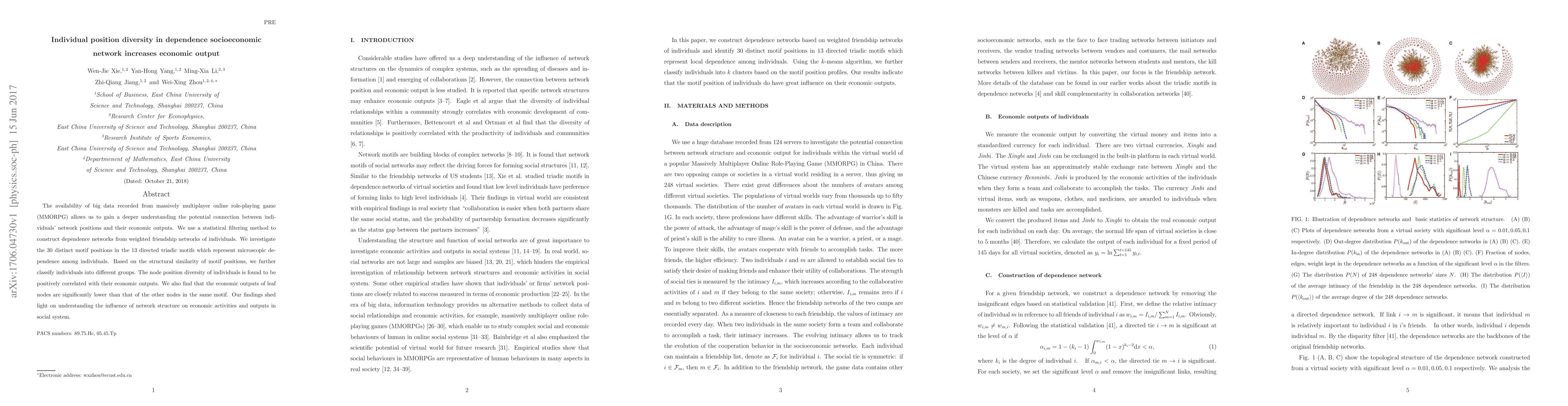 The availability of big data recorded from massively multiplayer online role-playing games (MMORPGs) allows us to gain a deeper understanding of the potential connection between individuals' network positions and their economic outputs. We use a statistical filtering method to construct dependence networks from weighted friendship networks of individuals. We investigate the 30 distinct motif positions in the 13 directed triadic motifs which represent microscopic dependences among individuals. Based on the structural similarity of motif positions, we further classify individuals into different groups. The node position diversity of individuals is found to be positively correlated with their economic outputs. We also find that the economic outputs of leaf nodes are significantly lower than that of the other nodes in the same motif. Our findings shed light on understanding the influence of network structure on economic activities and outputs in socioeconomic system.