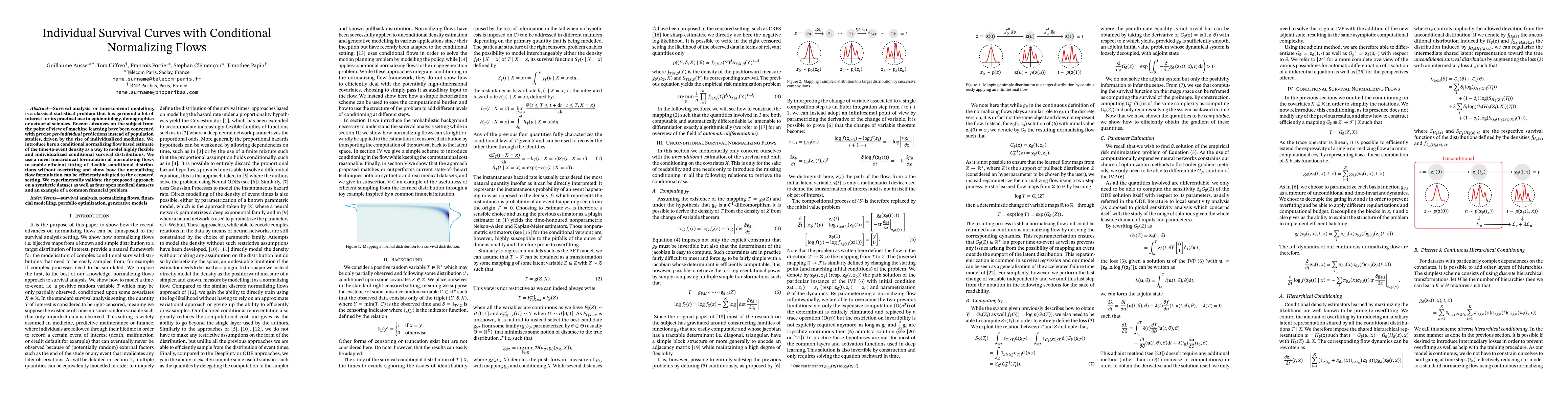 This paper proposes a conditional normalizing flow to model individualized survival curves for time-to-event data, enabling flexible and precise per-individual predictions. The approach uses a hierarchical formulation to efficiently fit conditional distributions without overfitting, validated on both synthetic and real medical datasets.