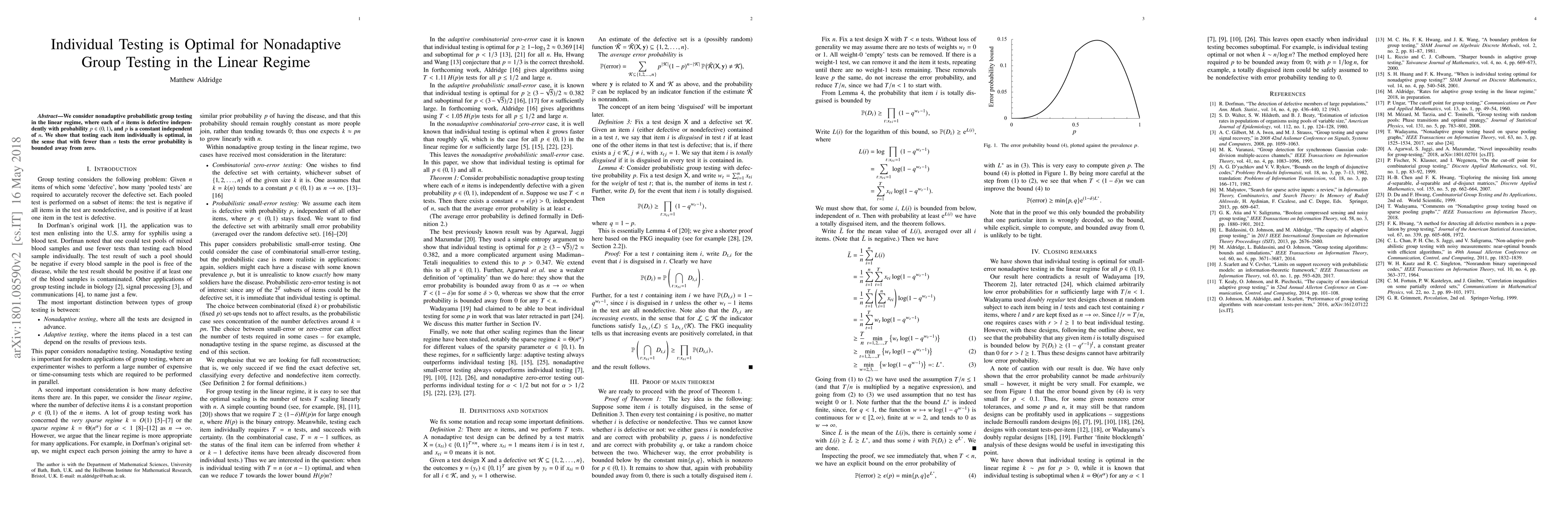 Summary: In nonadaptive probabilistic group testing within the linear regime, individual testing proves optimal as it minimizes error probability, whereas fewer than n individual tests result in a non-negligible error rate.