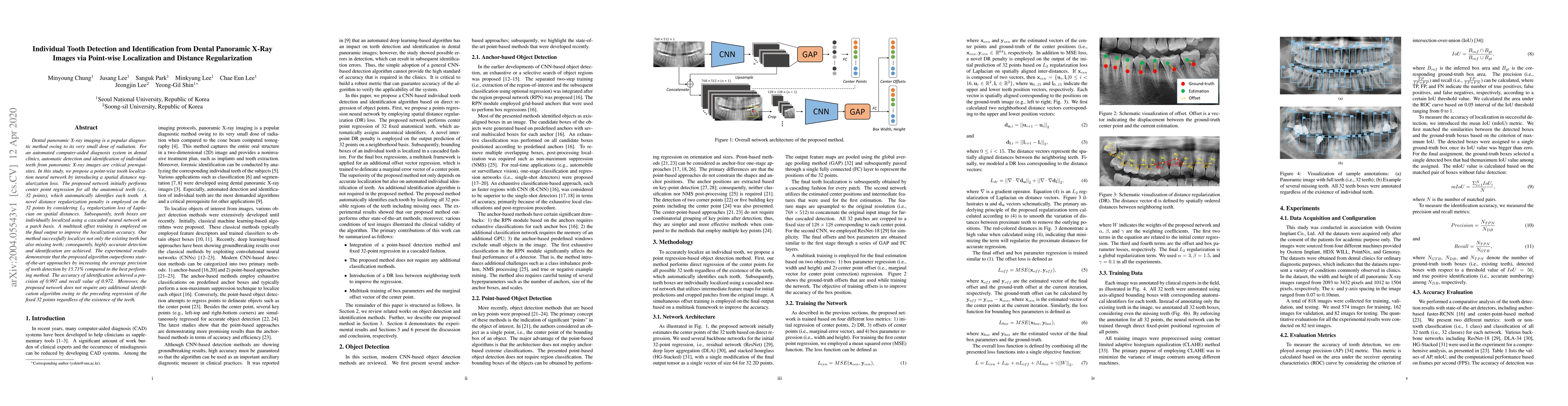 This paper proposes a neural network for automatic detection and identification of individual teeth in dental panoramic X-ray images using point-wise localization and spatial distance regularization. The method achieves high accuracy in detecting and identifying both present and missing teeth, outperforming existing methods by 15.71% in precision.