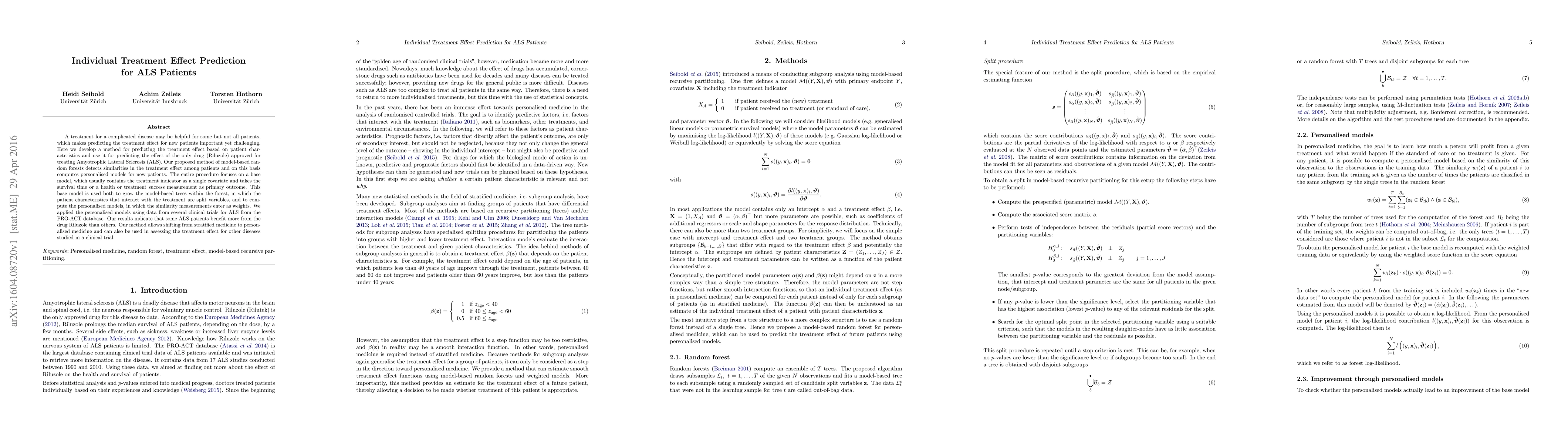 This paper develops a method using model-based random forests to predict individual treatment effects for ALS patients based on patient characteristics, showing that Riluzole benefits some ALS patients more than others. The proposed personalized models can shift the approach from stratified to personalized medicine and are applicable to other diseases studied in clinical trials.