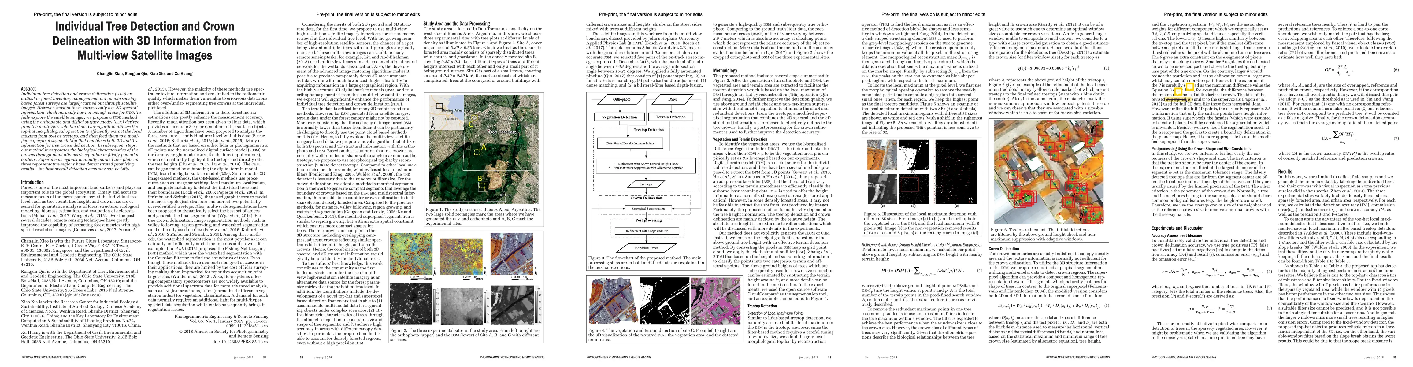 This paper proposes a method for individual tree detection and crown delineation using 3D information from multi-view satellite images, combining 2D orthophotos and 3D digital surface models. The method employs morphological operations and superpixel segmentation to achieve high detection accuracy, validated with 89% accuracy in experiments across three regions.
