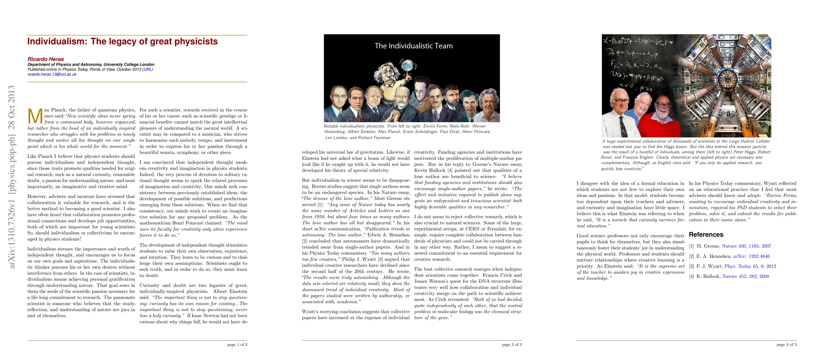 A recent high school graduate addresses the salient question: Should individualism or collectivism be encouraged in physics students? (Physics Today, Points of View, October 2013)