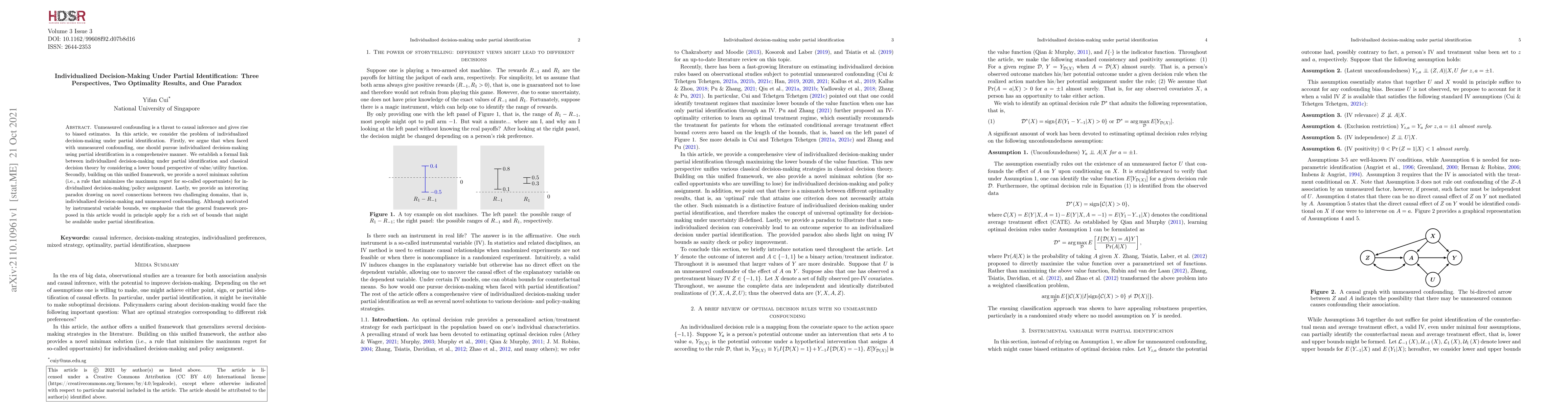 This paper explores individualized decision-making under partial identification in the presence of unmeasured confounding, proposing a framework that links this approach to classical decision theory. It introduces a novel minimax solution for policy assignment and highlights a paradox arising from the interplay between individualized decision-making and unmeasured confounding.