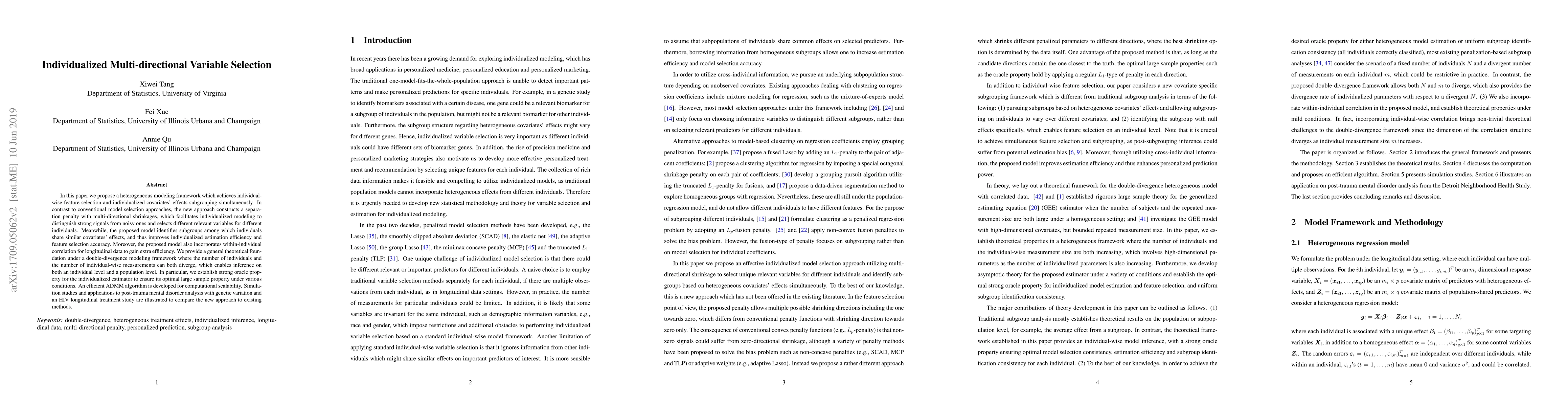 In this paper we propose a heterogeneous modeling framework which achieves individual-wise feature selection and individualized covariates' effects subgrouping simultaneously. In contrast to conventional model selection approaches, the new approach constructs a separation penalty with multi-directional shrinkages, which facilitates individualized modeling to distinguish strong signals from noisy ones and selects different relevant variables for different individuals. Meanwhile, the proposed model identifies subgroups among which individuals share similar covariates' effects, and thus improves individualized estimation efficiency and feature selection accuracy. Moreover, the proposed model also incorporates within-individual correlation for longitudinal data to gain extra efficiency. We provide a general theoretical foundation under a double-divergence modeling framework where the number of individuals and the number of individual-wise measurements can both diverge, which enables inference on both an individual level and a population level. In particular, we establish strong oracle property for the individualized estimator to ensure its optimal large sample property under various conditions. An efficient ADMM algorithm is developed for computational scalability. Simulation studies and applications to post-trauma mental disorder analysis with genetic variation and an HIV longitudinal treatment study are illustrated to compare the new approach to existing methods.