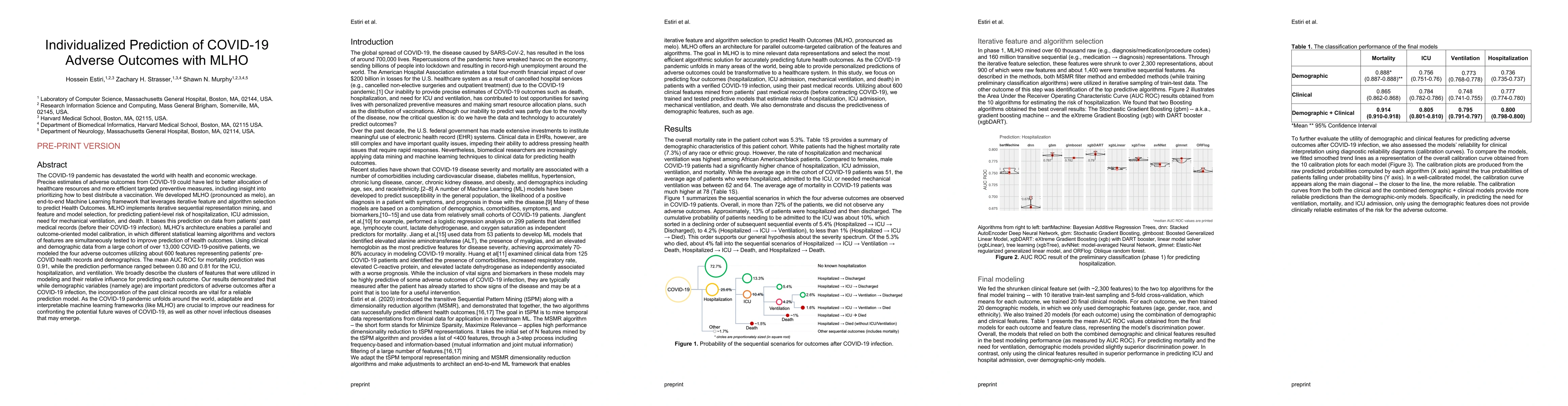 The MLHO framework uses machine learning to predict COVID-19 adverse outcomes like hospitalization and death, leveraging patient medical history and demographic data. The model achieved high accuracy, with an AUC ROC of 0.91 for mortality prediction, highlighting the importance of past clinical records in risk assessment.