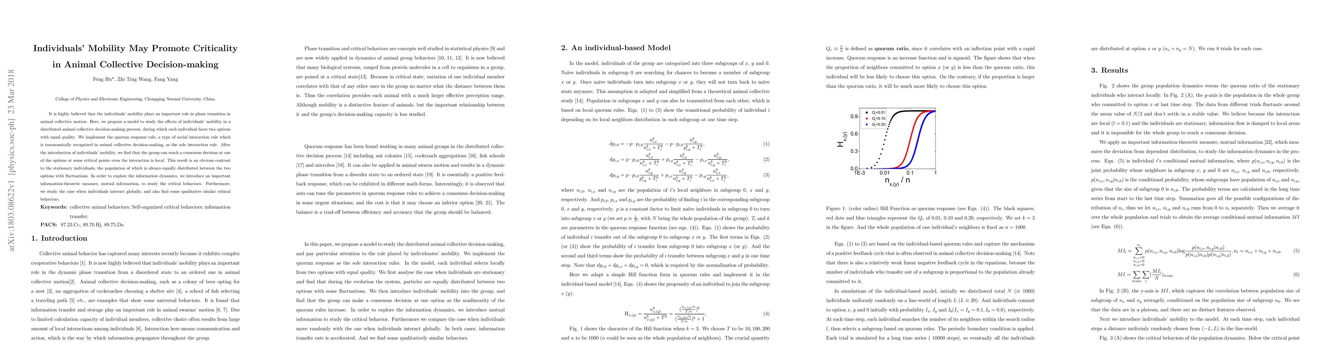 This paper proposes a model to investigate how individual mobility influences collective decision-making in animal groups, finding that mobile individuals can reach critical consensus decisions, contrasting with stationary groups that remain equally divided. The study uses mutual information to explore the dynamics behind these critical behaviors, revealing similar critical phenomena even under global interaction.