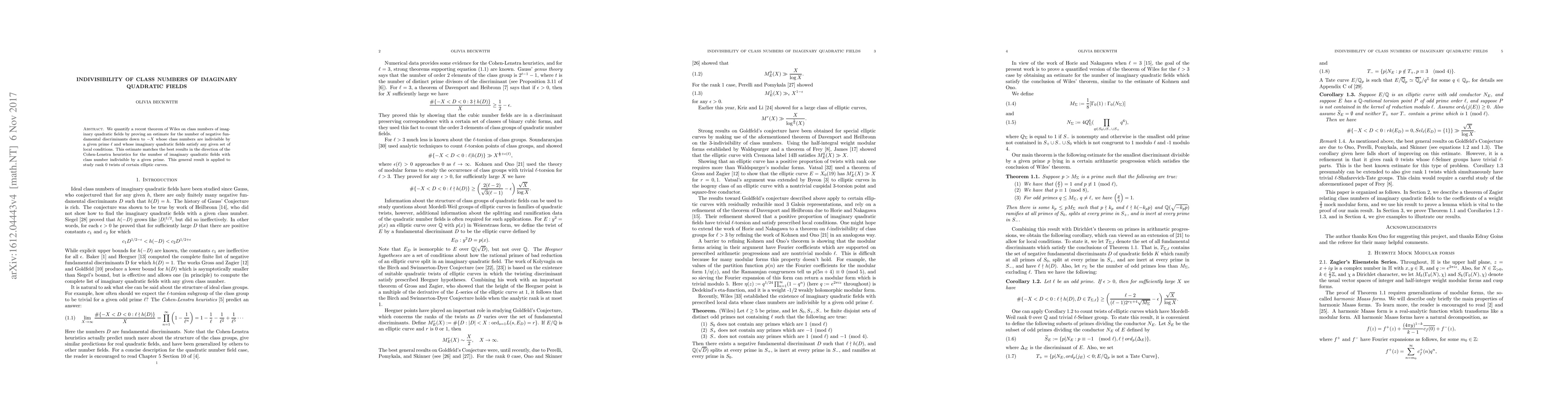 We quantify a recent theorem of Wiles on class numbers of imaginary quadratic fields by proving an estimate for the number of negative fundamental discriminants down to -X whose class numbers are indivisible by a given prime and whose imaginary quadratic fields satisfy any given set of local conditions. This estimate matches the best results in the direction of the Cohen-Lenstra heuristics for the number of imaginary quadratic fields with class number indivisible by a given prime. This general result is applied to study rank 0 twists of certain elliptic curves.