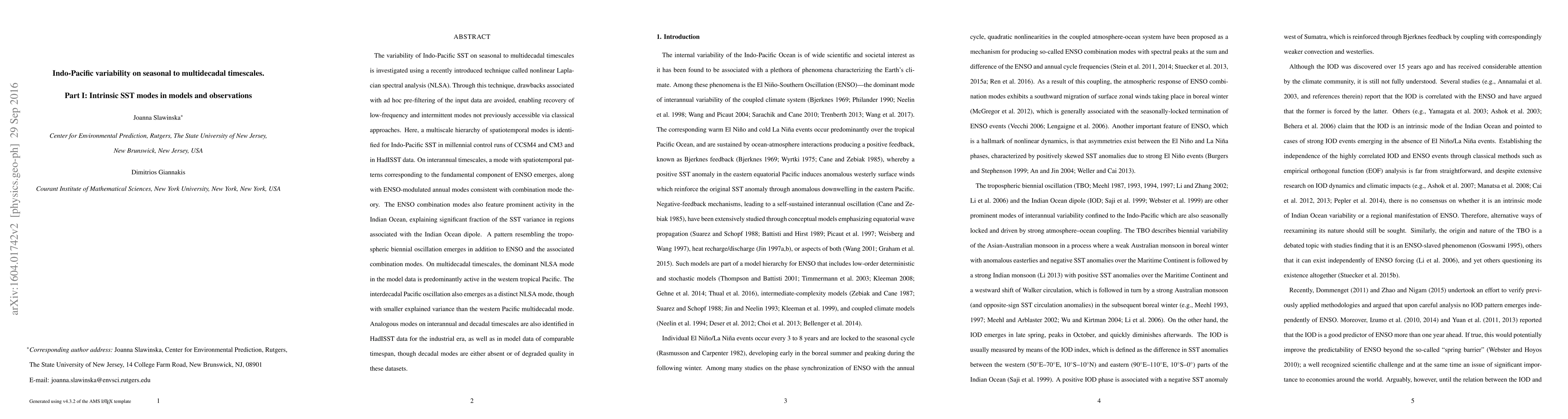 This paper investigates Indo-Pacific sea surface temperature (SST) variability using nonlinear Laplacian spectral analysis (NLSA), identifying a multiscale hierarchy of spatiotemporal modes in models and observations. It reveals ENSO-related modes and the Indian Ocean dipole, along with a pattern resembling the tropospheric biennial oscillation, and a dominant multidecadal mode in the western tropical Pacific.