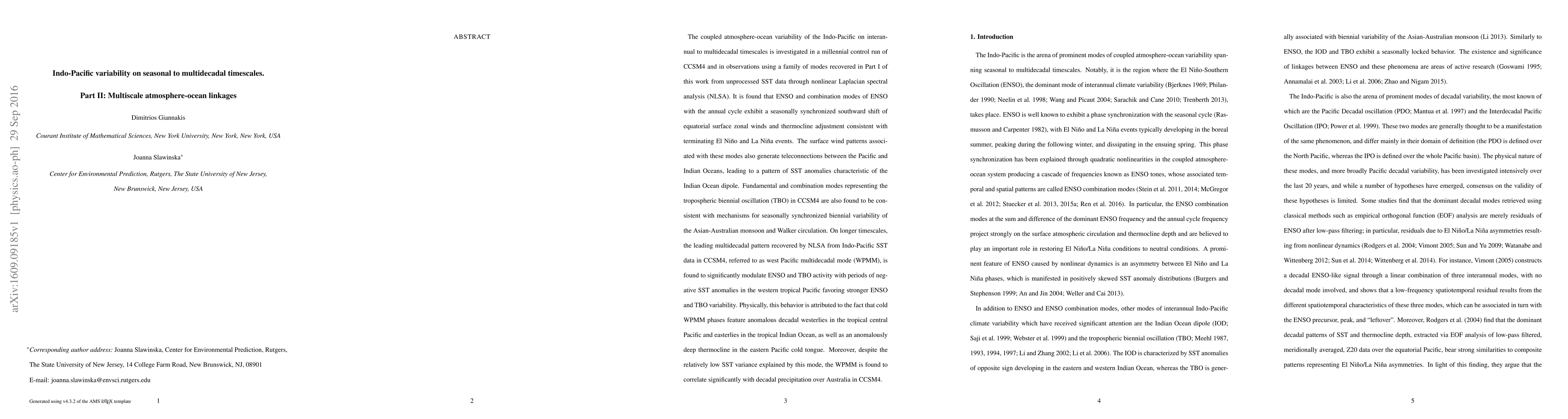 The coupled atmosphere-ocean variability of the Indo-Pacific on interannual to multidecadal timescales is investigated in a millennial control run of CCSM4 and in observations using a family of modes recovered in Part~I of this work from unprocessed SST data through nonlinear Laplacian spectral analysis (NLSA). It is found that ENSO and combination modes of ENSO with the annual cycle exhibit a seasonally synchronized southward shift of equatorial surface zonal winds and thermocline adjustment consistent with terminating El Nino and La Nina events. The surface wind patterns associated with these modes also generate teleconnections between the Pacific and Indian Oceans, leading to a pattern of SST anomalies characteristic of the Indian Ocean dipole. Fundamental and combination modes representing the tropospheric biennial oscillation (TBO) in CCSM4 are also found to be consistent with mechanisms for seasonally synchronized biennial variability of the Asian-Australian monsoon and Walker circulation. On longer timescales, the leading multidecadal pattern recovered by NLSA from Indo-Pacific SST data in CCSM4, referred to as west Pacific multidecadal mode (WPMM), is found to significantly modulate ENSO and TBO activity with periods of negative SST anomalies in the western tropical Pacific favoring stronger ENSO and TBO variability. Physically, this behavior is attributed to the fact that cold WPMM phases feature anomalous decadal westerlies in the tropical central Pacific and easterlies in the tropical Indian Ocean, as well as an anomalously deep thermocline in the eastern Pacific cold tongue. Moreover, despite the relatively low SST variance explained by this mode, the WPMM is found to correlate significantly with decadal precipitation over Australia in CCSM4.