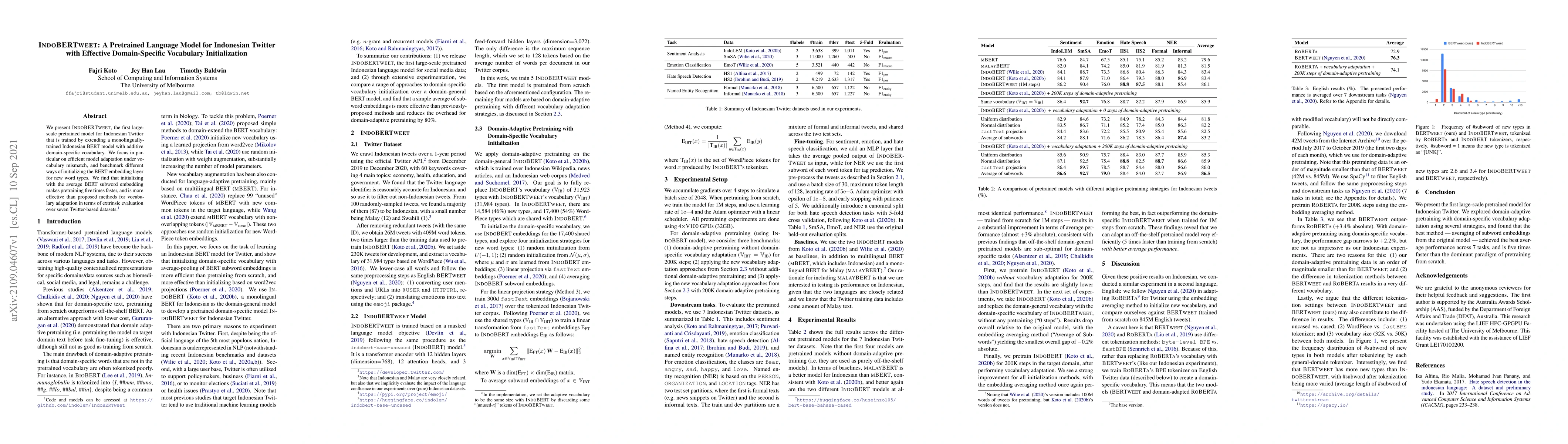 We present IndoBERTweet, the first large-scale pretrained model for Indonesian Twitter that is trained by extending a monolingually-trained Indonesian BERT model with additive domain-specific vocabulary. We focus in particular on efficient model adaptation under vocabulary mismatch, and benchmark different ways of initializing the BERT embedding layer for new word types. We find that initializing with the average BERT subword embedding makes pretraining five times faster, and is more effective than proposed methods for vocabulary adaptation in terms of extrinsic evaluation over seven Twitter-based datasets.