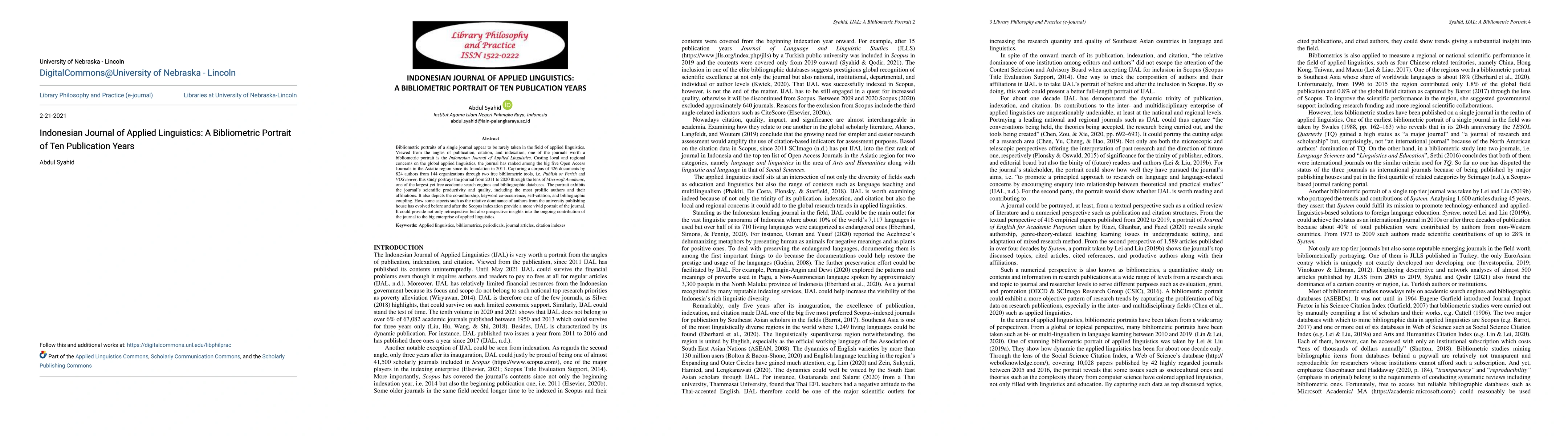 Bibliometric portraits of a single journal appear to be rarely taken in the field of applied linguistics. Viewed from the angles of publication, citation, and indexation, one of the journals worth a bibliometric portrait is the Indonesian Journal of Applied Linguistics. Casting local and regional concerns on the global applied linguistics, the journal has ranked among the big five Open Access Journals in the Asiatic region since its foundation in 2011.