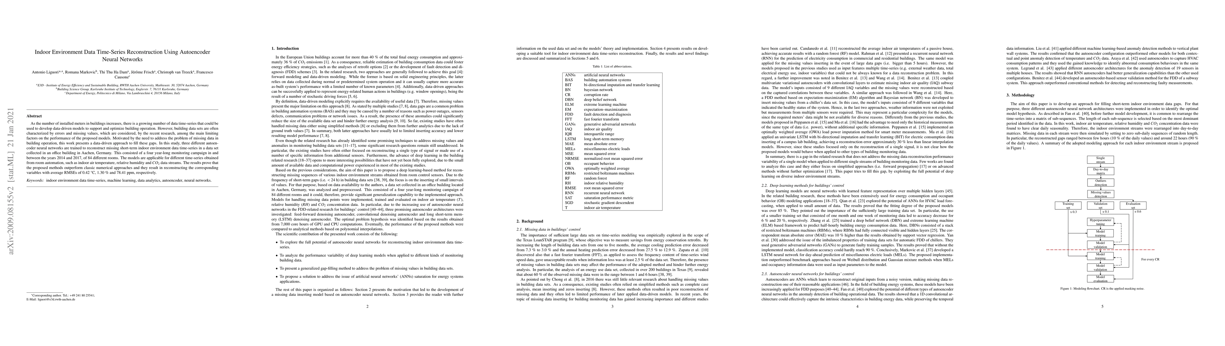 As the number of installed meters in buildings increases, there is a growing number of data time-series that could be used to develop data-driven models to support and optimize building operation. However, building data sets are often characterized by errors and missing values, which are considered, by the recent research, among the main limiting factors on the performance of the proposed models. Motivated by the need to address the problem of missing data in building operation, this work presents a data-driven approach to fill these gaps. In this study, three different autoencoder neural networks are trained to reconstruct missing short-term indoor environment data time-series in a data set collected in an office building in Aachen, Germany. This consisted of a four year-long monitoring campaign in and between the years 2014 and 2017, of 84 different rooms. The models are applicable for different time-series obtained from room automation, such as indoor air temperature, relative humidity and $CO_{2}$ data streams. The results prove that the proposed methods outperform classic numerical approaches and they result in reconstructing the corresponding variables with average RMSEs of 0.42 {\deg}C, 1.30 % and 78.41 ppm, respectively.