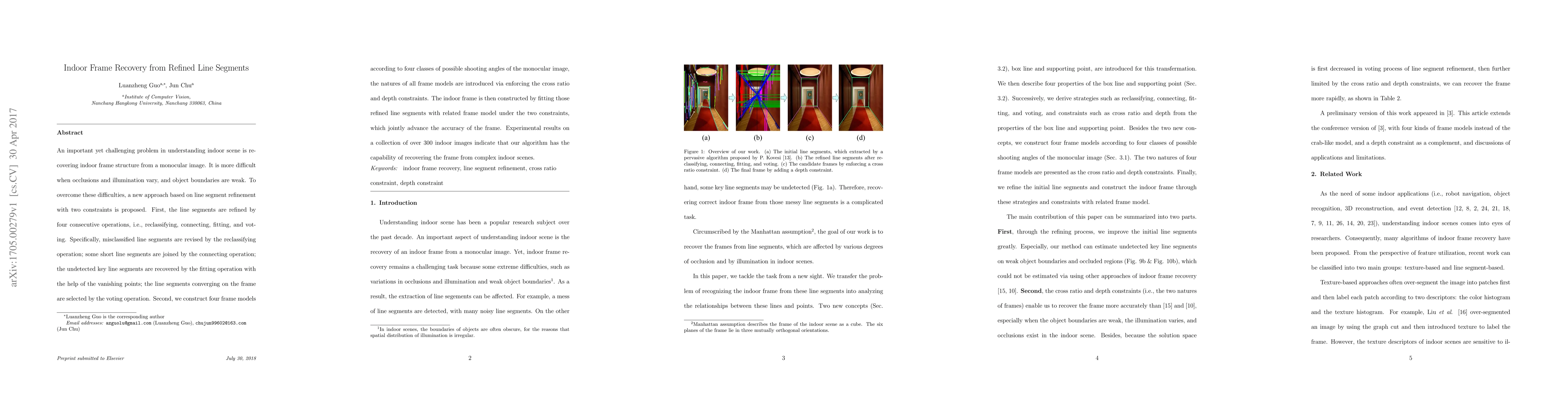This research introduces a novel method to recover indoor frame structures from monocular images using line segment refinement. It involves four operations - reclassifying, connecting, fitting, and voting - and four frame models constrained by cross ratio and depth. Experiments on over 300 images demonstrate its effectiveness in complex indoor scenes.