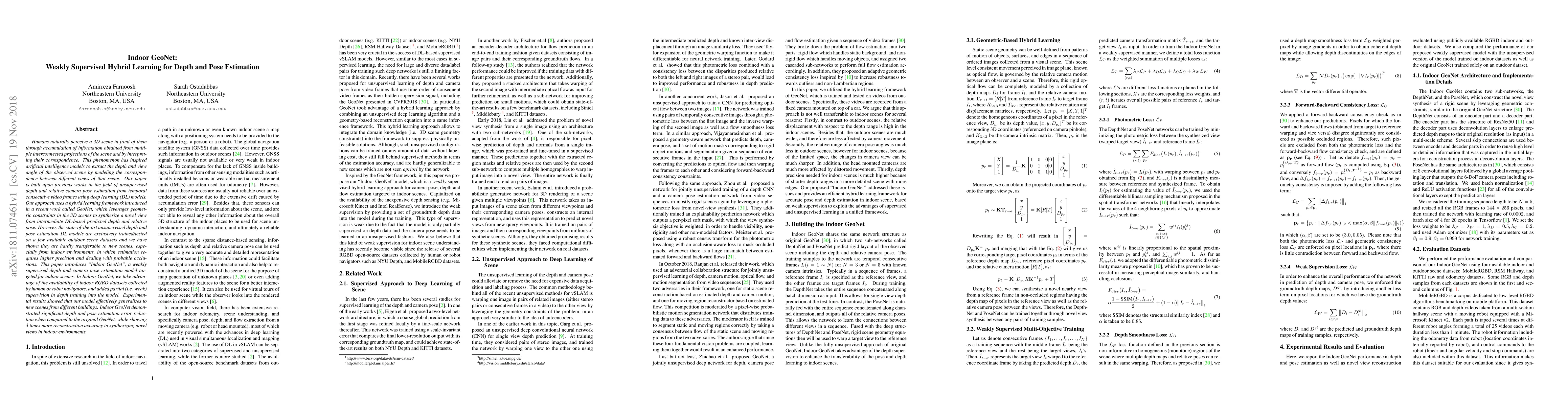 Indoor GeoNet introduces a weakly supervised hybrid learning framework for depth and pose estimation specifically tailored for indoor scenes, leveraging indoor RGBD datasets and partial supervision. The model significantly reduces estimation errors and improves reconstruction accuracy compared to the original GeoNet, demonstrating better generalization to new indoor environments.