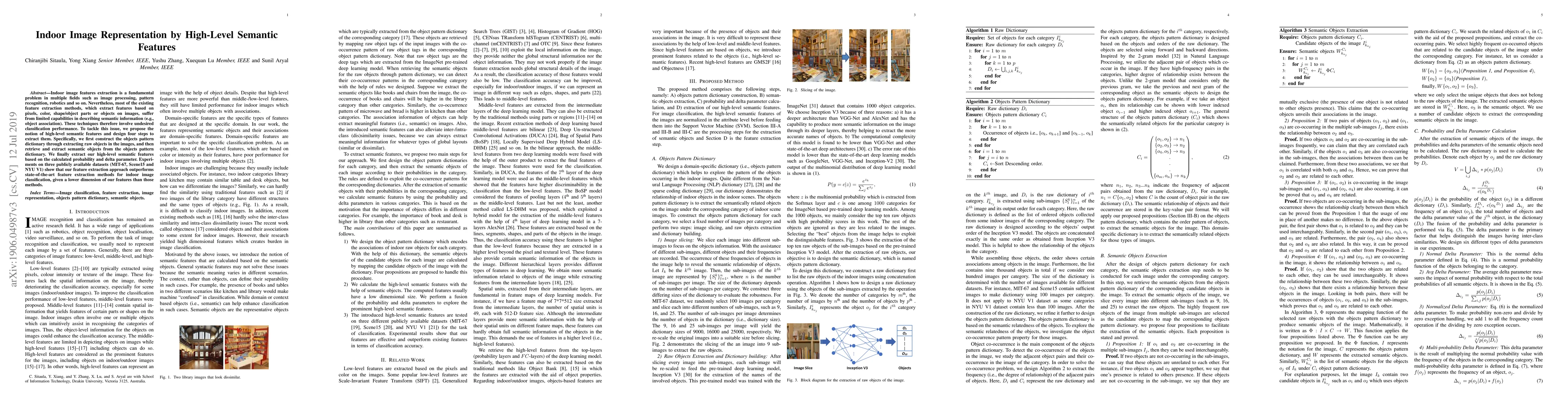 Indoor image features extraction is a fundamental problem in multiple fields such as image processing, pattern recognition, robotics and so on. Nevertheless, most of the existing feature extraction methods, which extract features based on pixels, color, shape/object parts or objects on images, suffer from limited capabilities in describing semantic information (e.g., object association). These techniques, therefore, involve undesired classification performance. To tackle this issue, we propose the notion of high-level semantic features and design four steps to extract them. Specifically, we first construct the objects pattern dictionary through extracting raw objects in the images, and then retrieve and extract semantic objects from the objects pattern dictionary. We finally extract our high-level semantic features based on the calculated probability and delta parameter. Experiments on three publicly available datasets (MIT-67, Scene15 and NYU V1) show that our feature extraction approach outperforms state-of-the-art feature extraction methods for indoor image classification, given a lower dimension of our features than those methods.