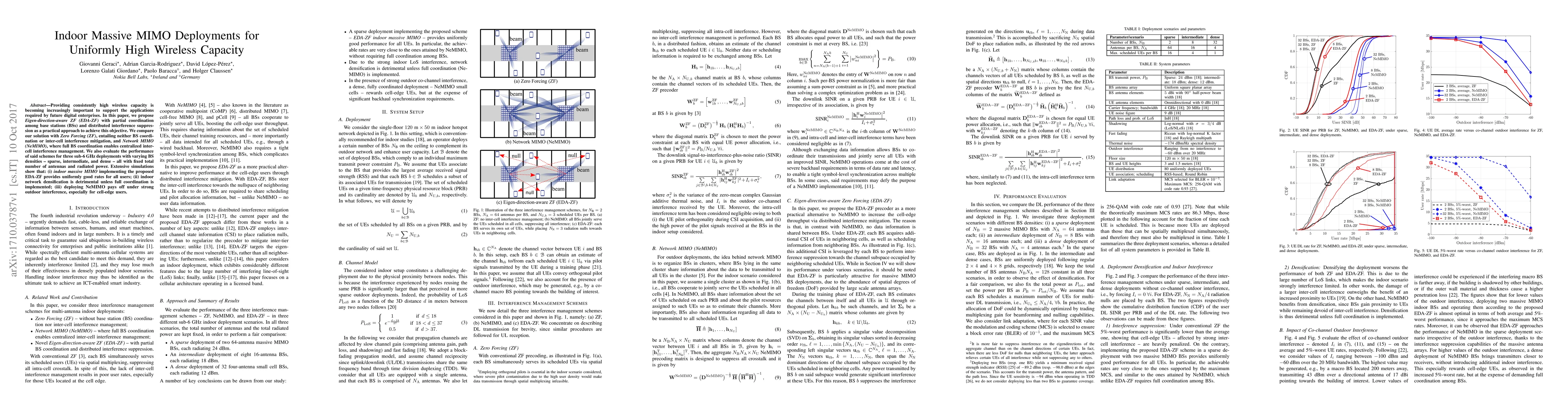 This paper proposes Eigen-direction-aware ZF (EDA-ZF) for indoor massive MIMO to achieve uniformly high wireless capacity, comparing it against Zero Forcing and Network MIMO. Results show EDA-ZF provides consistent user rates, while network densification without full coordination is harmful.