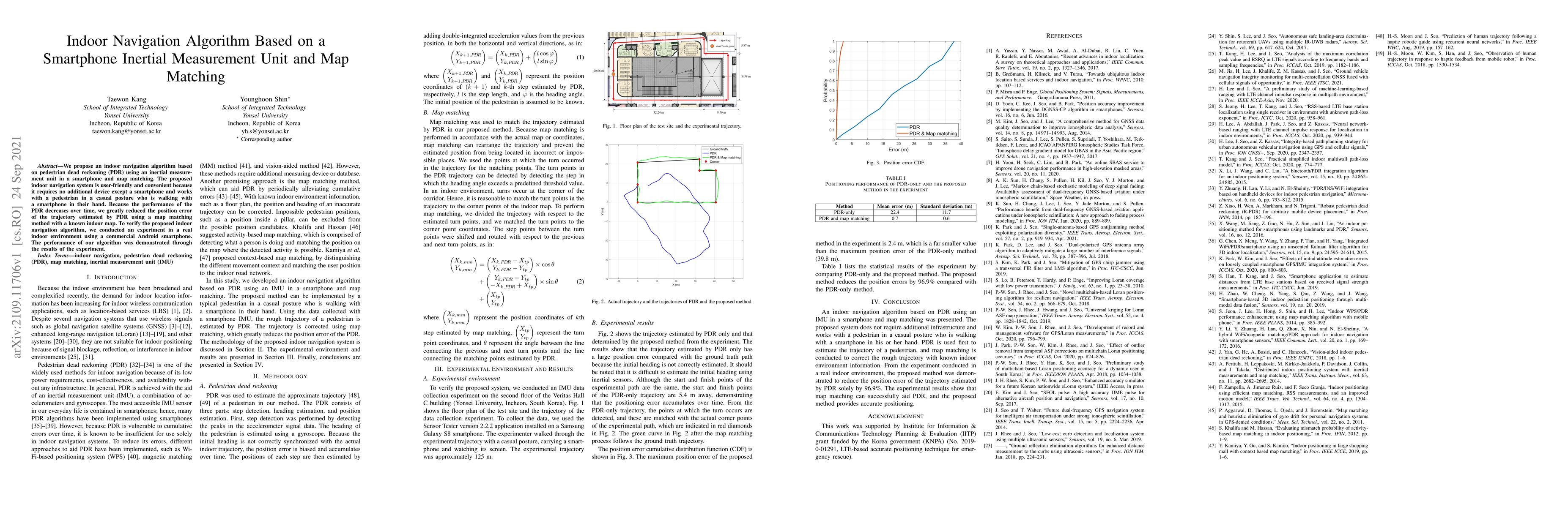 This paper proposes an indoor navigation algorithm utilizing a smartphone's inertial measurement unit for pedestrian dead reckoning (PDR) and map matching to reduce trajectory errors. The system requires only a smartphone, demonstrating effectiveness in a real indoor environment.