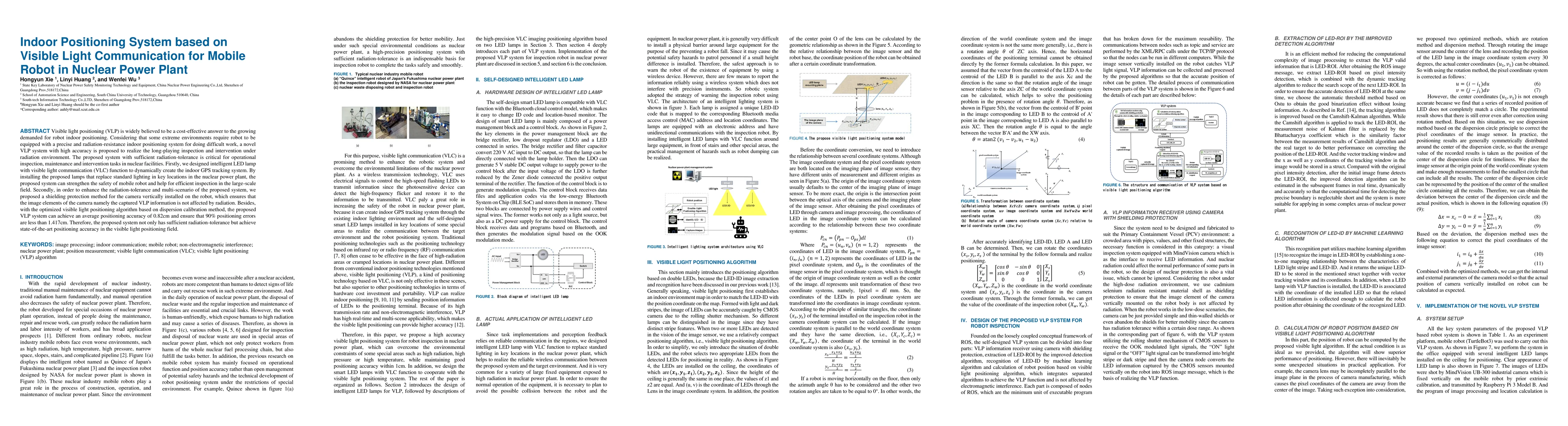 This paper proposes a visible light communication (VLC) based indoor positioning system for mobile robots in nuclear power plants, featuring intelligent LED lamps to create a GPS-like tracking system. The system includes a shielding method for the robot's camera to ensure radiation-tolerance and achieves an average positioning accuracy of 0.82 cm, making it suitable for precise inspection and maintenance in extreme environments.