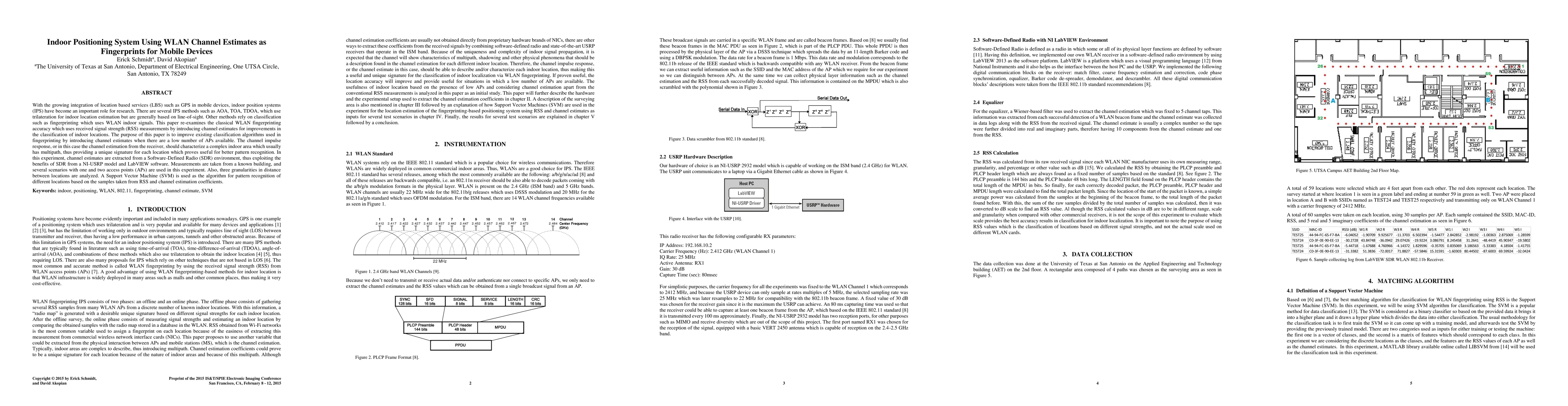 This paper proposes an indoor positioning system using WLAN channel estimates as fingerprints to improve location classification accuracy. It introduces channel estimates to enhance the fingerprinting method, especially when few access points are available, leveraging a Software-Defined Radio environment for data collection and employing a Support Vector Machine for pattern recognition.