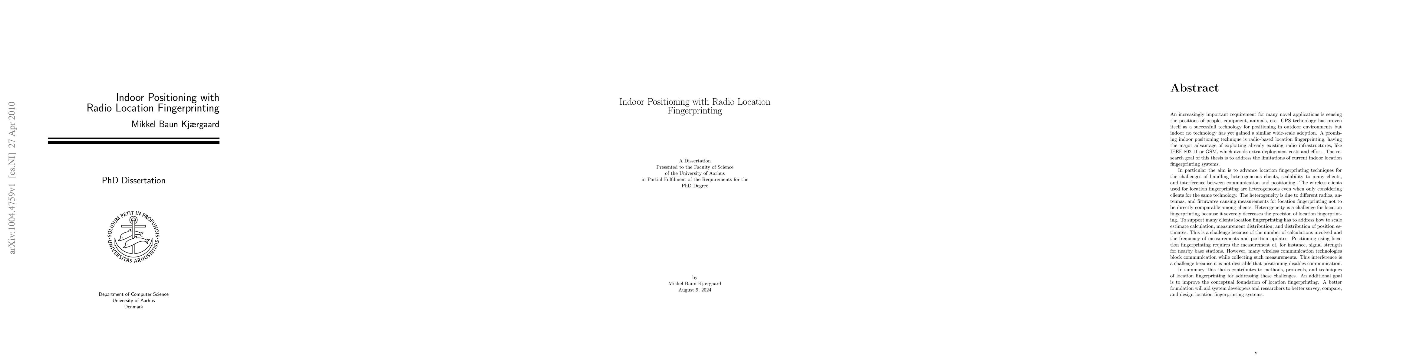This paper explores radio-based location fingerprinting for indoor positioning, focusing on addressing the challenges of heterogeneous clients, scalability, and interference between communication and positioning. The aim is to improve the precision and efficiency of location fingerprinting techniques, leveraging existing radio infrastructures like IEEE 802.11.