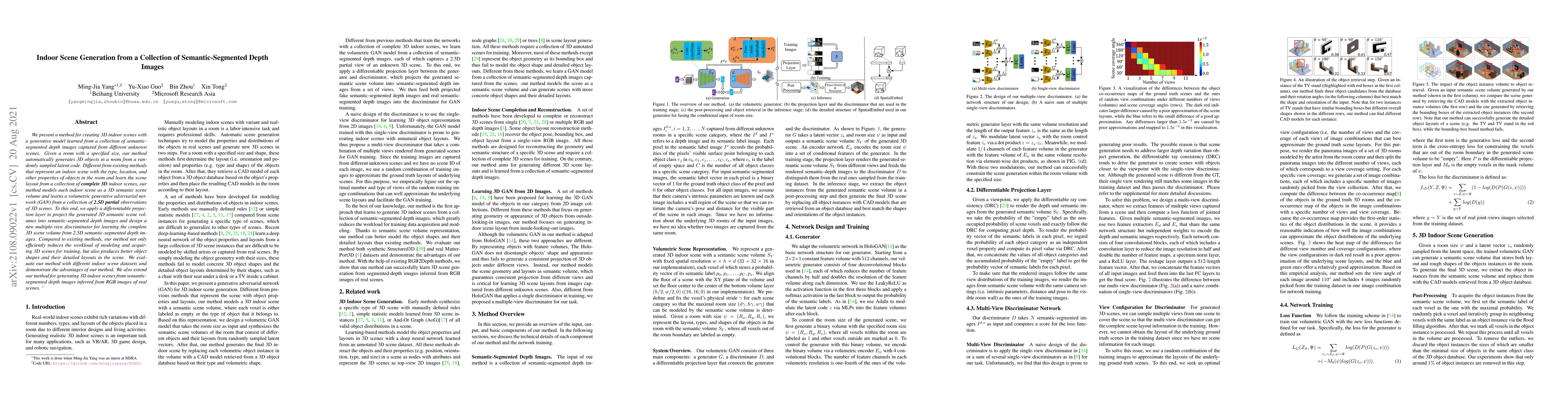 This paper proposes a generative model for creating 3D indoor scenes using a volumetric GAN trained on semantic-segmented depth images, reducing the need for complete 3D scene data. The method generates 3D objects and layouts more efficiently and accurately compared to existing techniques.