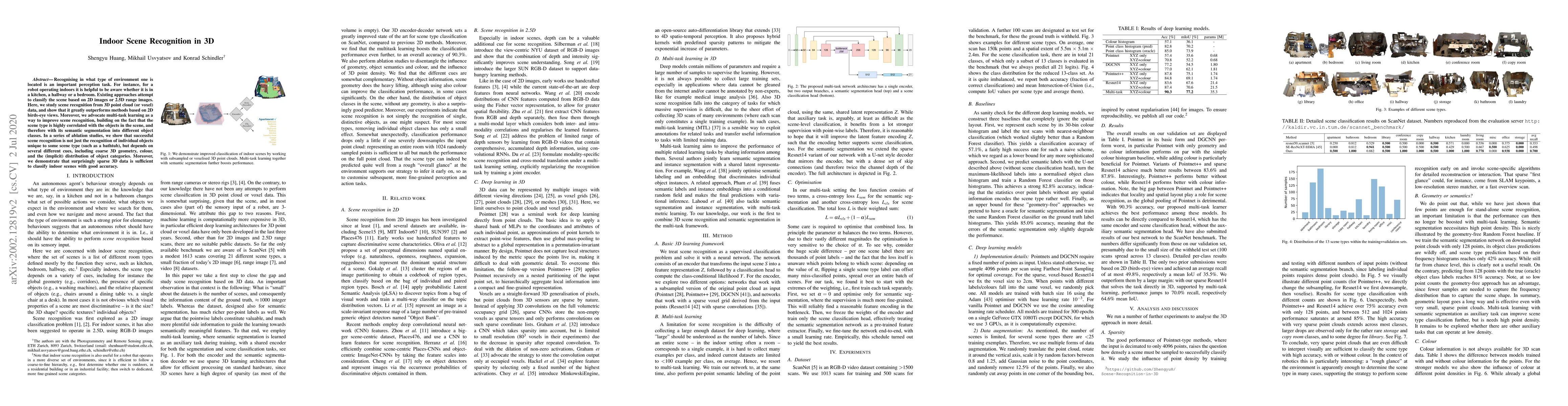 This paper explores indoor scene recognition using 3D point cloud data, demonstrating superior performance over 2D and 2.5D methods. It advocates multi-task learning to leverage correlations between scene types and object classes, showing that successful recognition depends on various cues, including geometry and object distribution, with sparse 3D data yielding good accuracy.