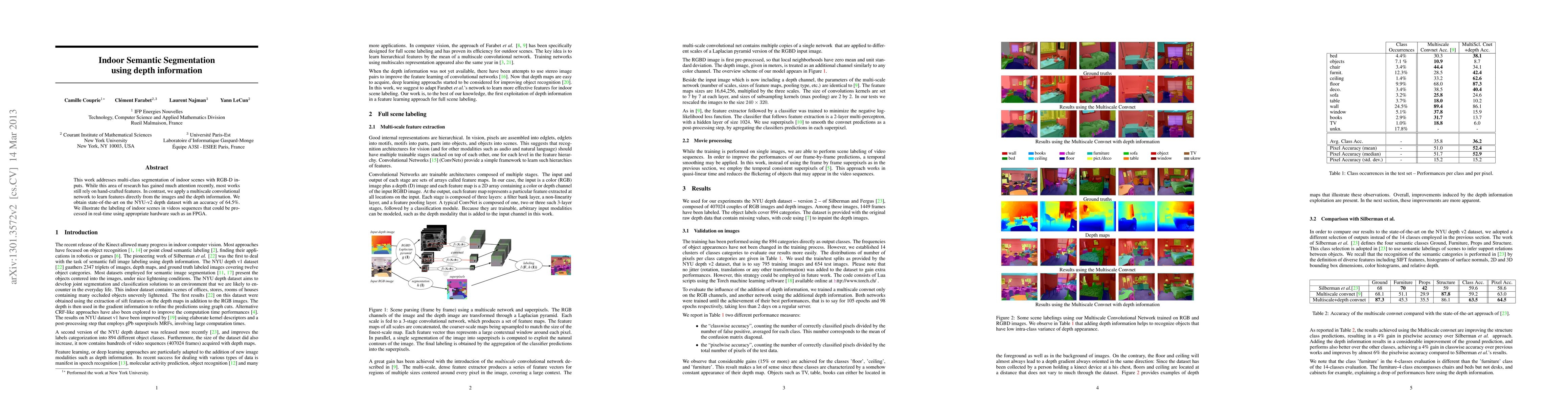 This research proposes a multiscale convolutional network for indoor semantic segmentation using RGB-D inputs, achieving state-of-the-art accuracy of 64.5% on the NYU-v2 dataset, and demonstrates real-time processing potential with FPGA hardware.