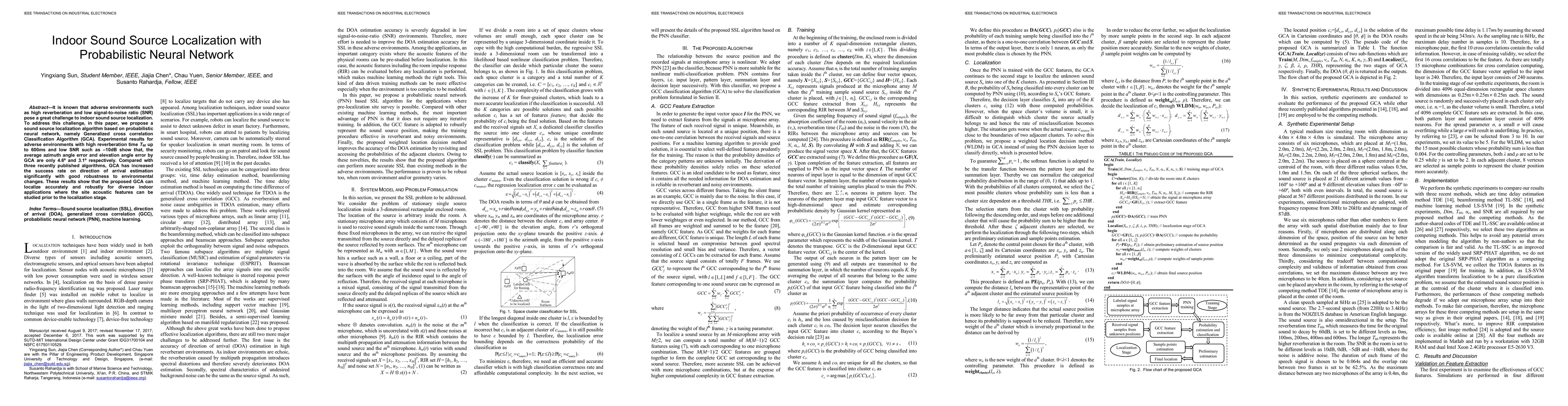 The research proposes a sound source localization algorithm, Generalized cross correlation Classification Algorithm (GCA), based on probabilistic neural network (PNN) for adverse indoor environments with high reverberation (up to T60 = 600ms) and low signal-to-noise ratio (SNR) such as -10dB.