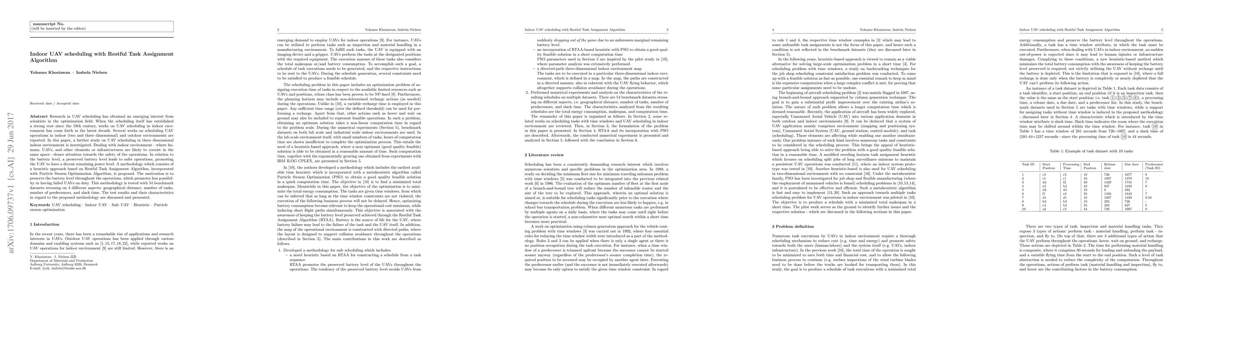 This paper proposes a heuristic approach combining the Restful Task Assignment Algorithm with Particle Swarm Optimization to optimize UAV scheduling in three-dimensional indoor environments, focusing on preserving battery levels to enhance safety and operational success. The methodology is tested using 54 benchmark datasets, evaluating its performance across geographical distance, task numbers, predecessors, and slack time.