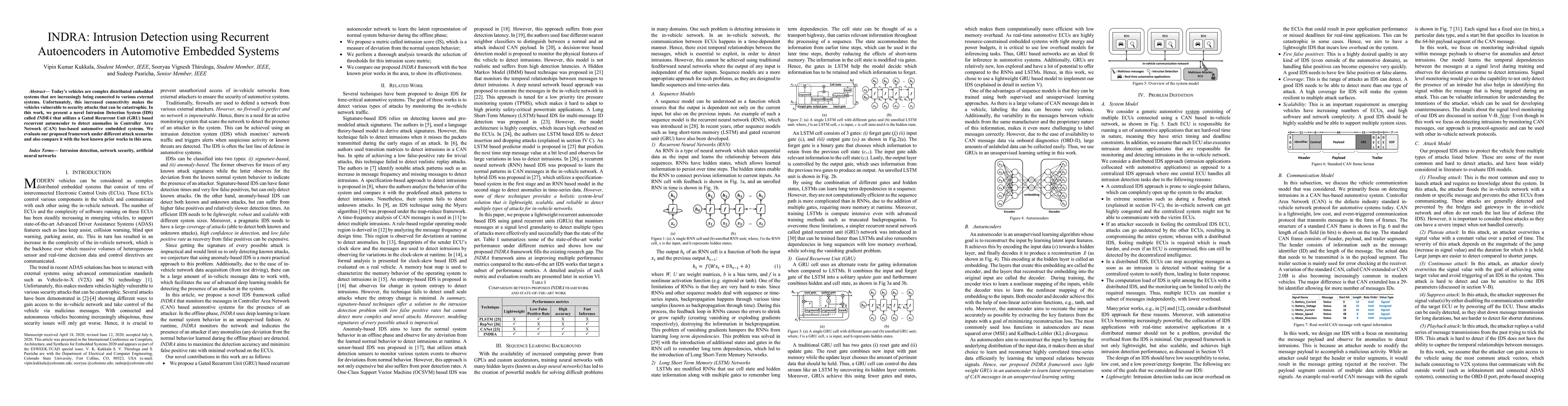 INDRA is an Intrusion Detection System for automotive embedded systems that employs a GRU-based recurrent autoencoder to detect anomalies in CAN bus traffic. The framework is evaluated against various attack scenarios and outperforms existing methods.