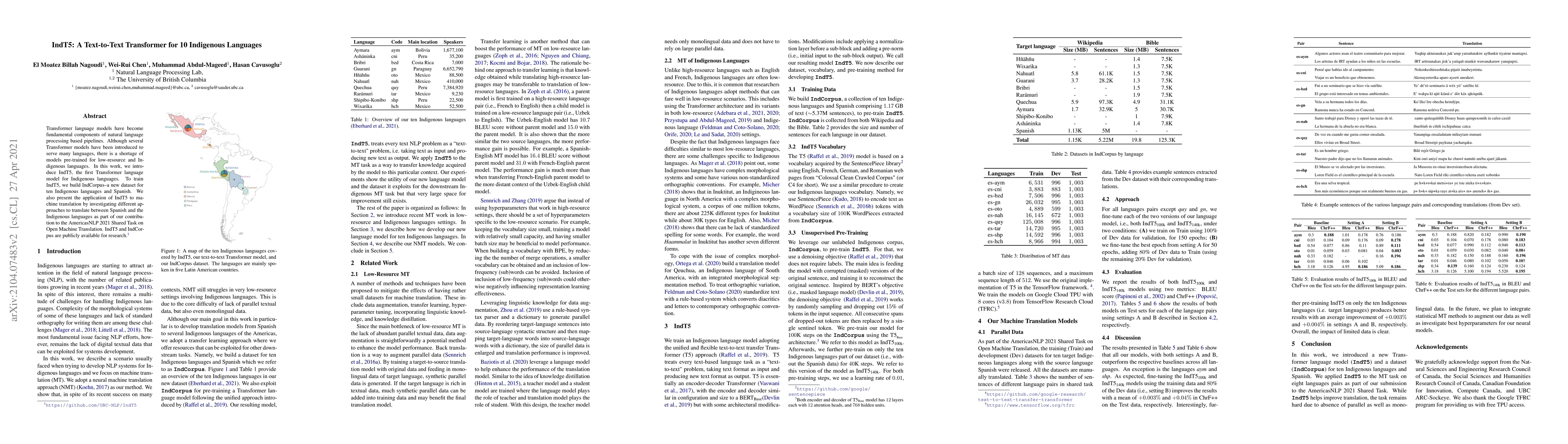 IndT5 is a novel Transformer language model designed for ten Indigenous languages, addressing the scarcity of such models for low-resource languages. The research introduces IndCorpus, a new dataset used to train IndT5, and explores its application in machine translation between Spanish and Indigenous languages.