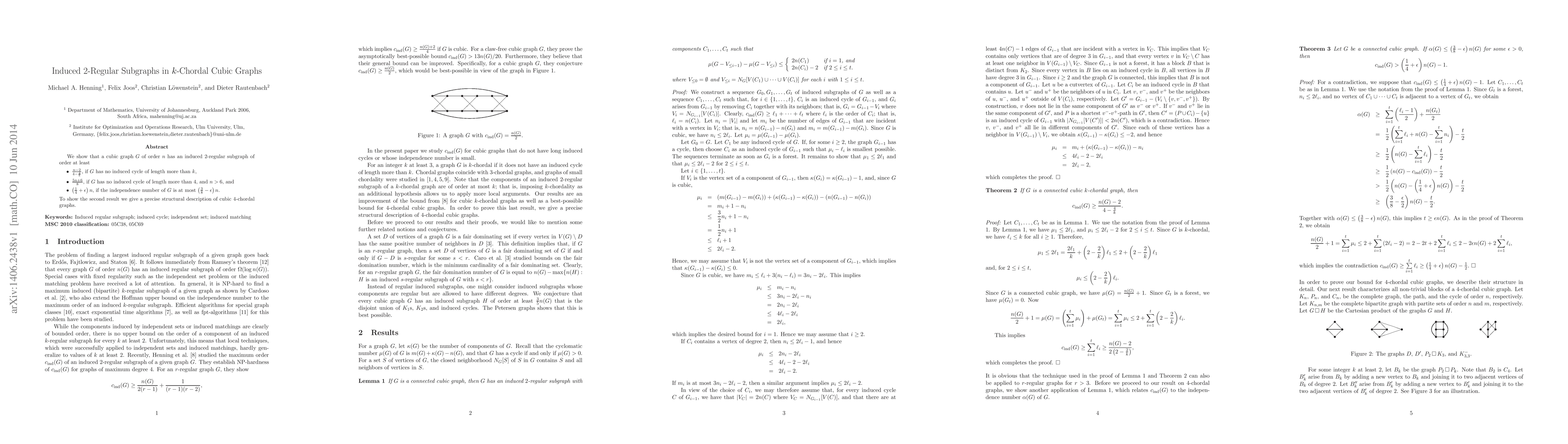 We show that a cubic graph $G$ of order $n$ has an induced $2$-regular subgraph of order at least a) $\frac{n-2}{4-\frac{4}{k}}$, if $G$ has no induced cycle of length more than $k$, b) $\frac{5n+6}{8}$, if $G$ has no induced cycle of length more than $4$, and $n>6$, and c) $\left(\frac{1}{4}+\epsilon\right)n$, if the independence number of $G$ is at most $\left(\frac{3}{8}-\epsilon\right)n$. To show the second result we give a precise structural description of cubic $4$-chordal graphs.
