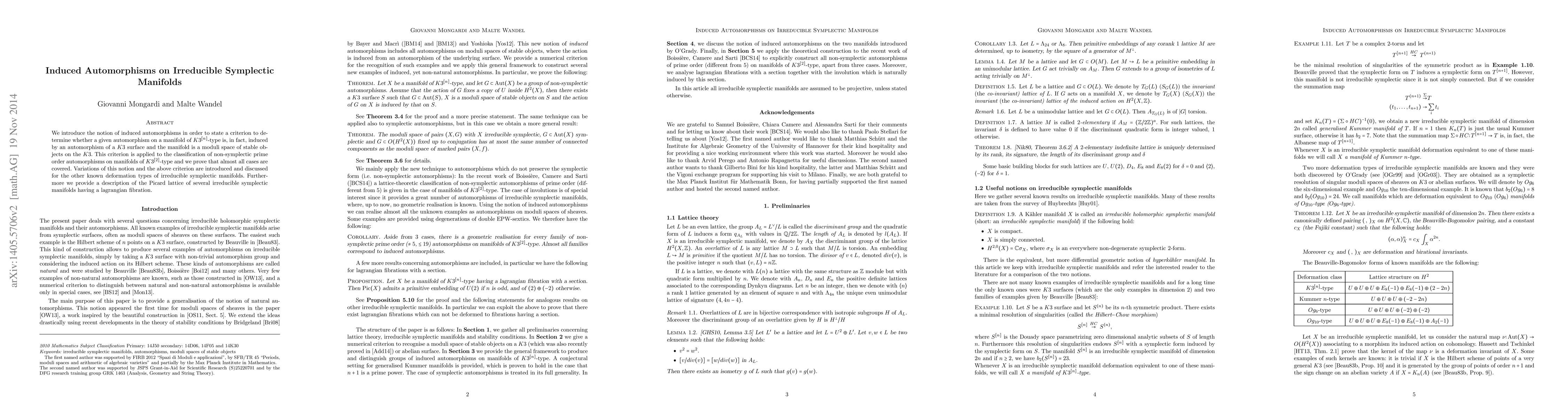This paper develops a criterion for identifying induced automorphisms on $K3^{[n]}$ manifolds, showing that most non-symplectic prime order automorphisms on $K3^{[2]}$ type manifolds are accounted for. It also explores variations of this notion for other deformation types and describes the Picard lattice of specific irreducible symplectic manifolds with lagrangian fibrations.