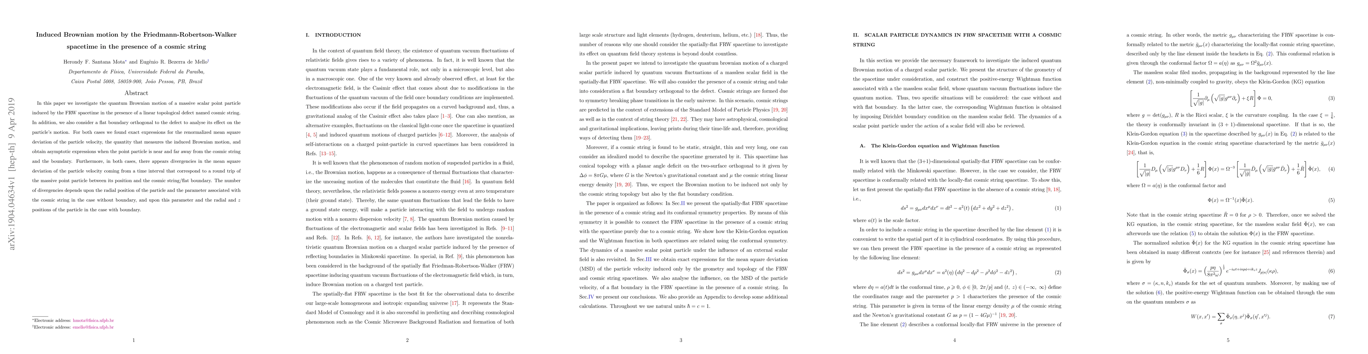 In this paper we investigate the quantum Brownian motion of a massive scalar point particle induced by the FRW spacetime in the presence of a linear topological defect named cosmic string. In addition, we also consider a flat boundary orthogonal to the defect to analyse its effect on the particle's motion. For both cases we found exact expressions for the renormalized mean square deviation of the particle velocity, the quantity that measures the induced Brownian motion, and obtain asymptotic expressions when the point particle is near and far away from the cosmic string and the boundary. Furthermore, in both cases, there appears divergencies in the mean square deviation of the particle velocity coming from a time interval that correspond to a round trip of the massive point particle between its position and the cosmic string/flat boundary. The number of divergencies depends upon the radial position of the particle and the parameter associated with the cosmic string in the case without boundary, and upon this parameter and the radial and $z$ positions of the particle in the case with boundary.