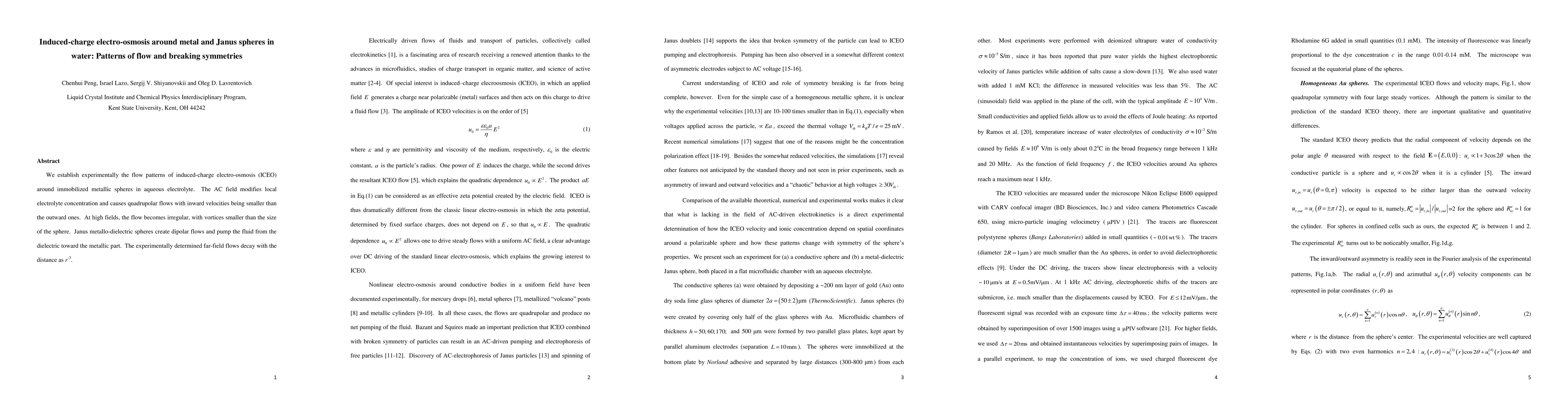 This study experimentally investigates induced-charge electro-osmosis (ICEO) around metallic and Janus spheres in water, revealing quadrupolar flows and symmetry-breaking effects under AC fields. High field conditions induce irregular, small-scale vortices, while Janus spheres generate dipolar flows, pumping fluid towards the metallic side, with far-field flow decay following a r-3 law.