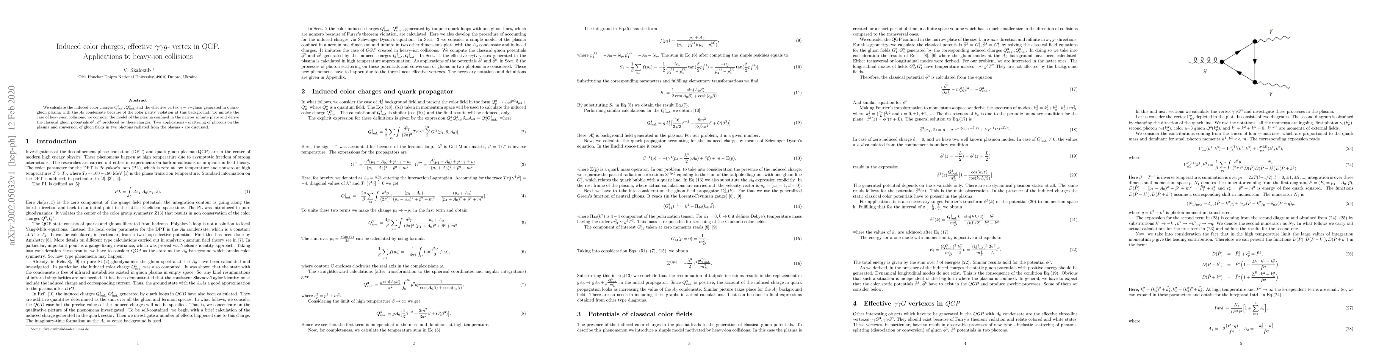 We calculate the induced color charges Q_{ind.}^3, Q_{ind.}^8 and the effective vertex gamma - gamma - gluon generated in quark-gluon plasma with the A_0 condensate because of the color parity violation at this background. To imitate the case of heavy-ion collisions, we consider the model of the plasma confined in the narrow infinite plate and derive the classical gluon potentials Phi^3, Phi^8 produced by these charges. Two applications - scattering of photons on the plasma and conversion of gluon fields in two photons radiated from the plasma - are discussed.