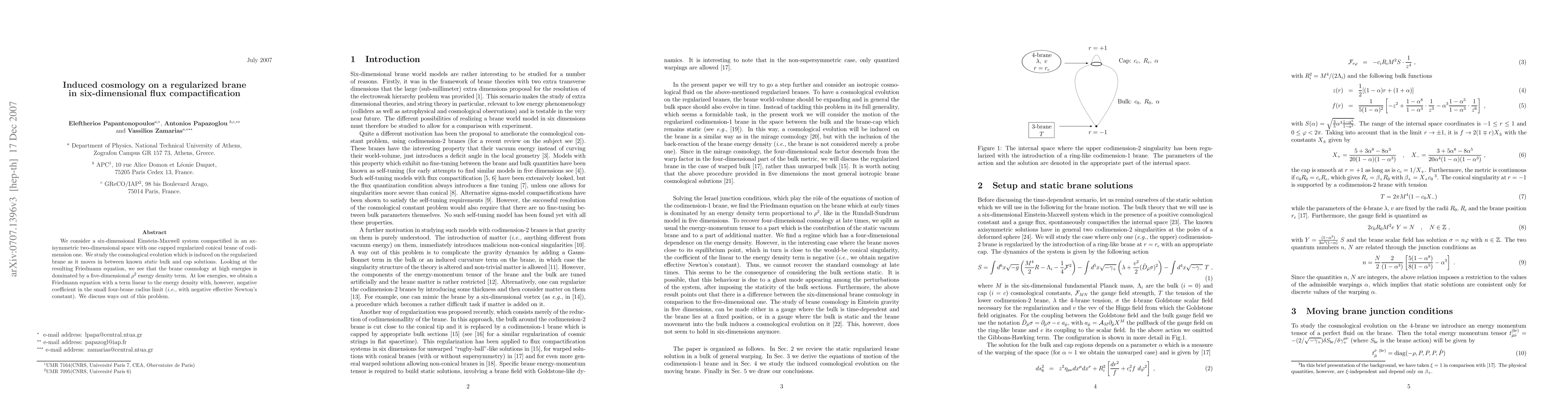 This paper explores a six-dimensional Einstein-Maxwell system compactified on an axisymmetric space with a regularized conical brane, investigating the induced cosmological evolution on the brane. At high energies, the brane cosmology is dominated by a five-dimensional rho^2 energy density term, while at low energies, it exhibits a linear term with a negative coefficient in the small brane radius limit, prompting discussions on resolving this issue.