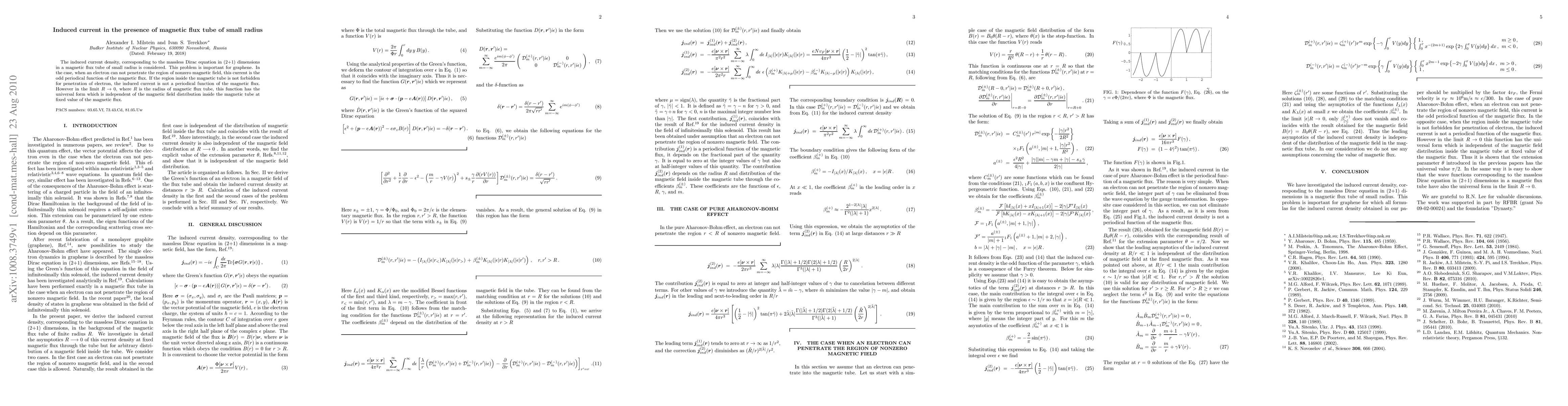 This paper investigates the induced current density in a magnetic flux tube of small radius within the context of the massless Dirac equation in (2+1) dimensions, particularly relevant to graphene. The study finds that the induced current is an odd periodic function of the magnetic flux when electrons cannot penetrate the magnetic field region, but becomes non-periodic when electron penetration is allowed. In the limit of a vanishingly small tube radius, the induced current exhibits a universal form independent of the magnetic field distribution inside the tube.